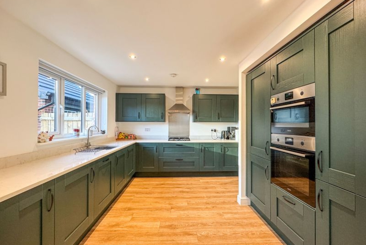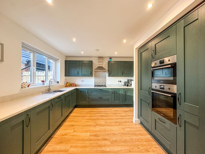The property briefly comprises: – Entrance hallway, downstairs W.C., separate study, spacious bright and airy lounge, offering floods of natural light from the window overlooking the front. The lounge has been fitted with a grey carpet and finished with modern décor throughout. This leads seamlessly into the central point of the home, which is a substantial open plan kitchen, dining and family room, with double patio doors to enjoy the views over a fabulous rear garden. The high spec kitchen has been fitted with solid wall and base units, finished with a white quartz benchtop, offering endless amounts of storage. Appliances include a large fridge/freezer, including a gas hob with an extractor fan above, two built in ovens and a dishwasher. To the rear of the kitchen, your further benefit from a separate utility room.