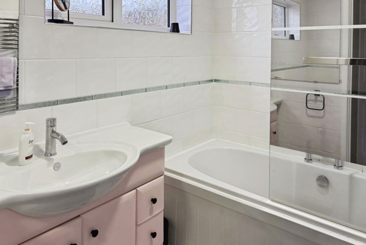 FAMILY BATHROOM: comprising of: bath with electric twin headed shower over and glass screen, wash hand basin set in vanity unit, tiled walls, heated towel rail, double glazed window to front.
