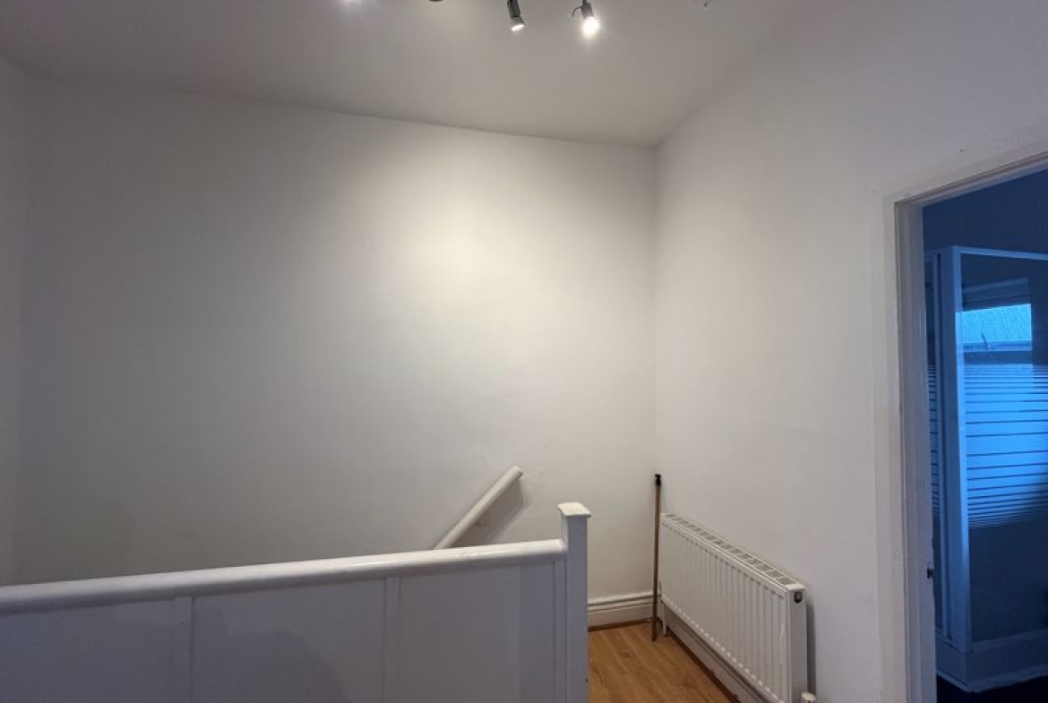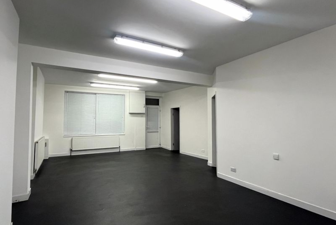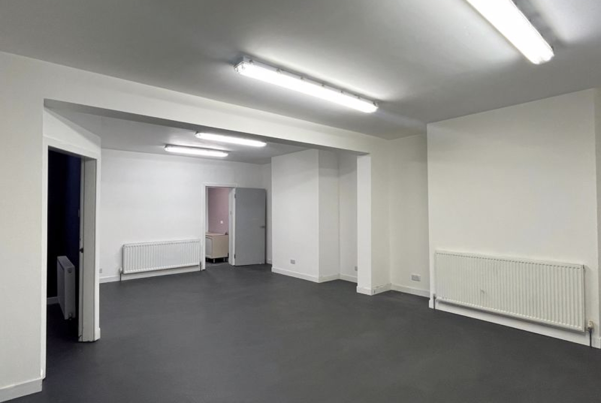 Two-storey premises with separate first-floor access. Includes rear double garage for storage. Floor Area circa 133 sq. m. (1,431 sq. ft.). Refurbished and suitable for various uses. Good visibility with regular local footfall. Excellent public transport links nearby. Eligible for small business rate relief, subject to verification.