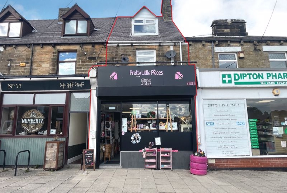 Mixed use three storey investment. Ground floor retail with three bedroom maisonette. Floor Area 121.8 sq. m. (1,311 sq. ft.). Producing £9,000 per annum rental income. Prominent position in the heart of Dipton village. Fully let to Pretty Little Pieces gift shop.