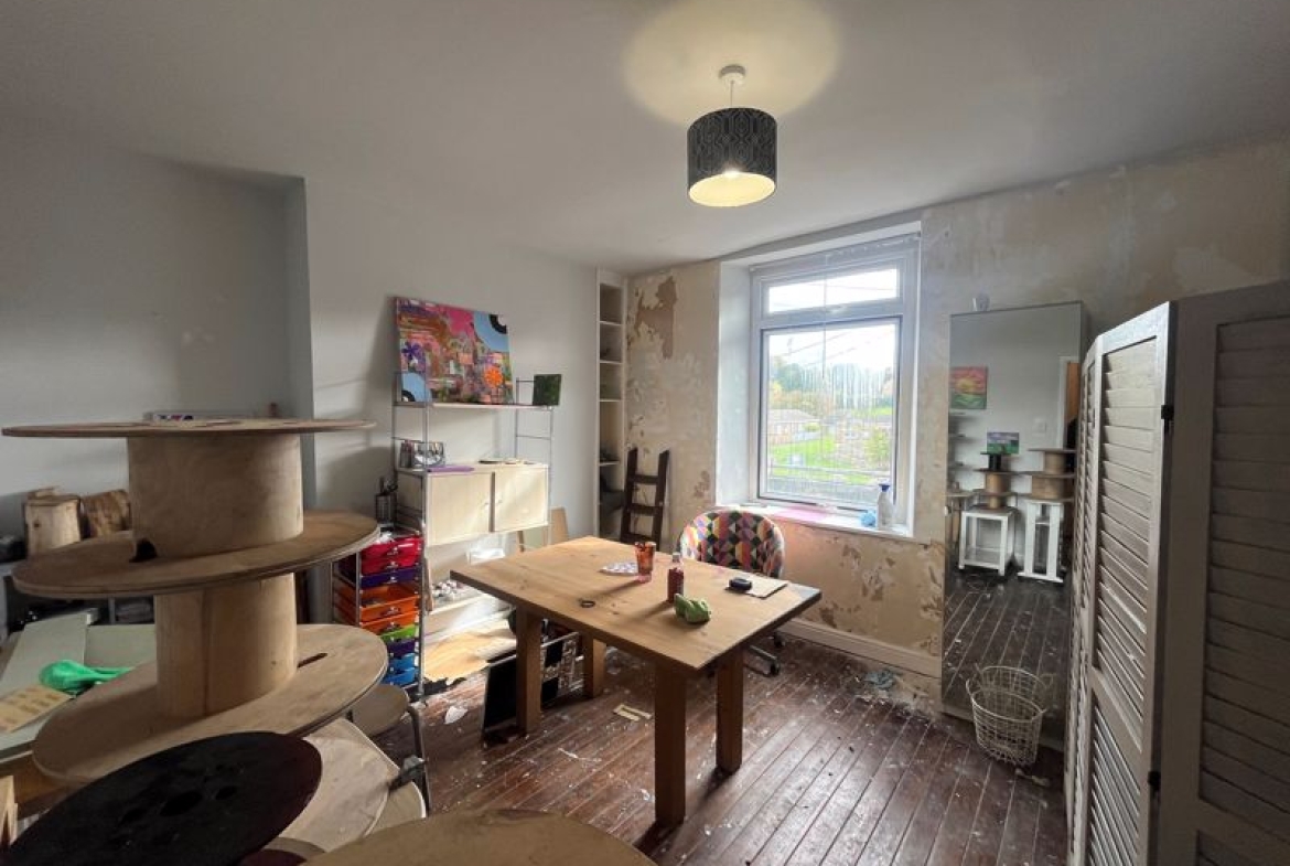 The property comprises a well-presented, mid-terrace, three-storey sandstone building beneath a pitched slate roof. The ground floor provides a self-contained retail unit, while the upper floors offer spacious residential accommodation arranged over the first and second floors, with an additional room within the converted loft space.