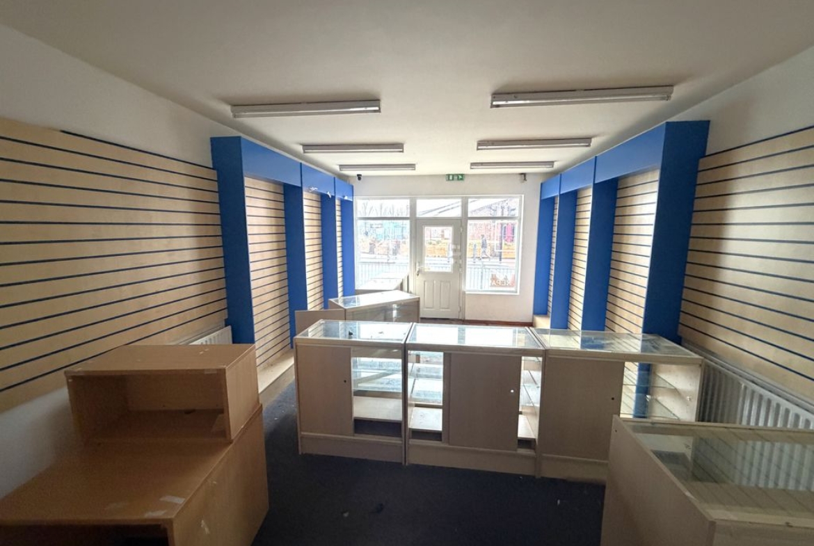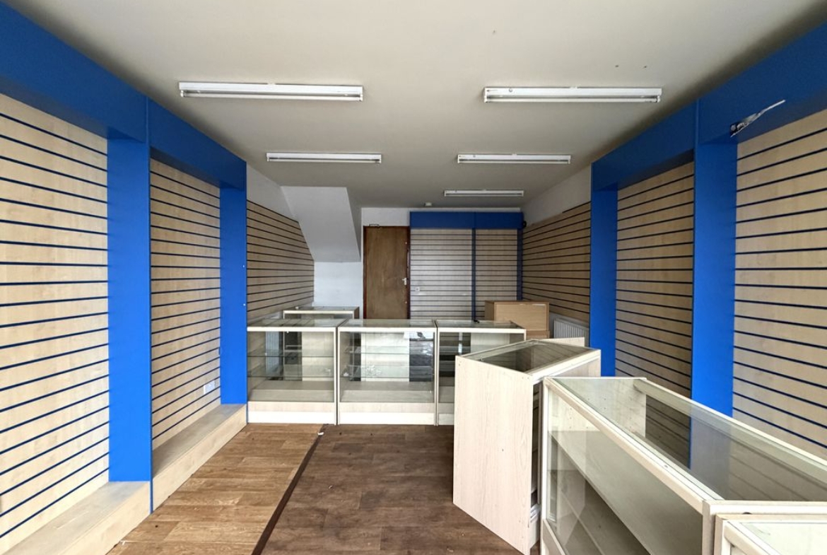 Prominent two storey retail unit in established commercial parade. Total area circa 55.45 sq. m. (596 sq. ft.). Electric roller shutters for added security. Potential for no business rates (subject to eligibility criteria). Suitable for various retail or service uses (STP). Strong roadside visibility and consistent pedestrian footfall.