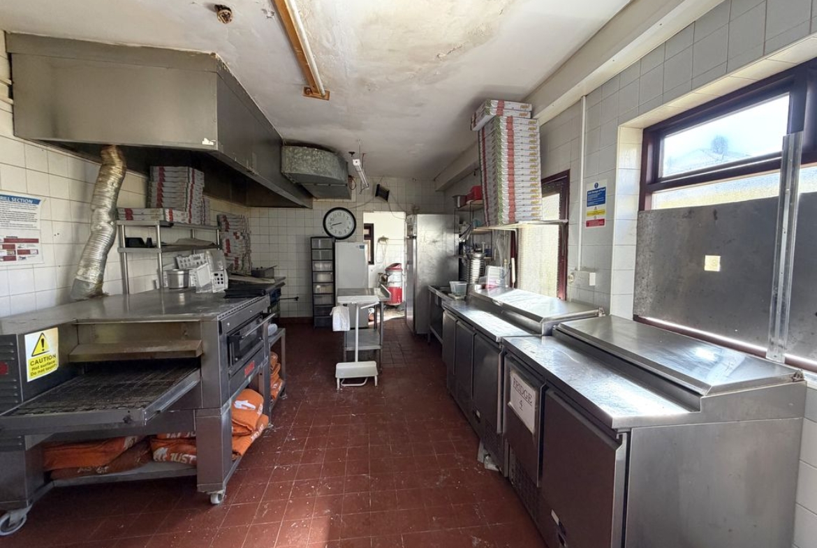 The ground floor comprises a fully equipped former fish and chip shop/pizza takeaway extending to approximately 882 sq. ft. (82 sq. m.). The layout includes an open-plan customer service area, commercial kitchen, preparation room, store room, and staff WC, making it well-suited for immediate reoccupation or alternative food-related uses (subject to the necessary consents).