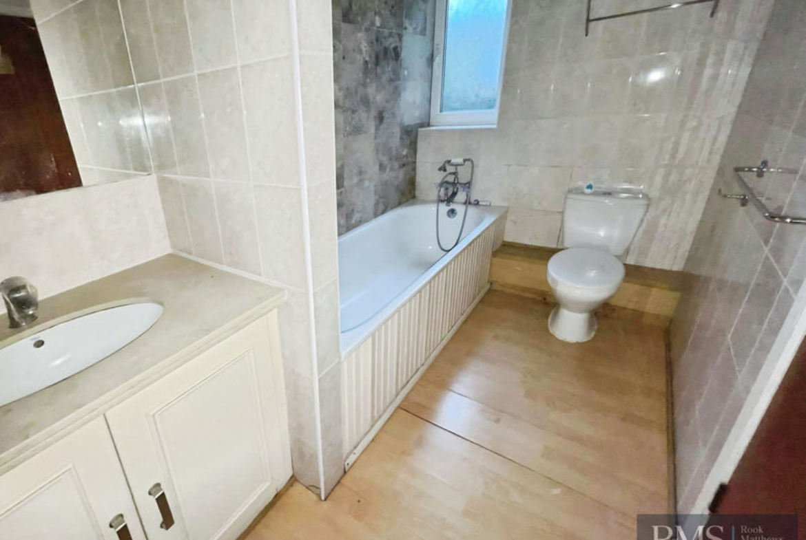 Double glazed frosted window, 3 piece white suite comprising; panelled bath with tap fed shower, sink set in vanity unit, low level w.c, airing cupboard housing hot water tank.