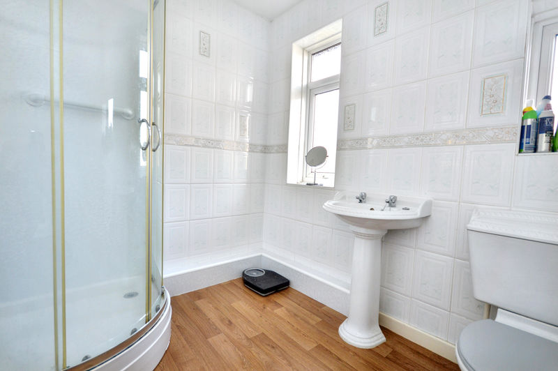 Wet wall panelled corner shower cubicle with mains shower | Pedestal wash-hand basin | Close coupled W.C | Radiator | Tiled walls | UPVC double-glazed frosted windows