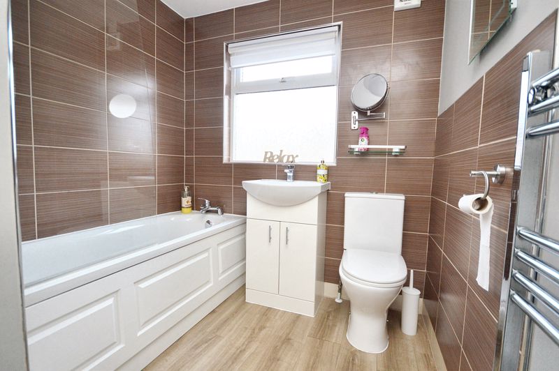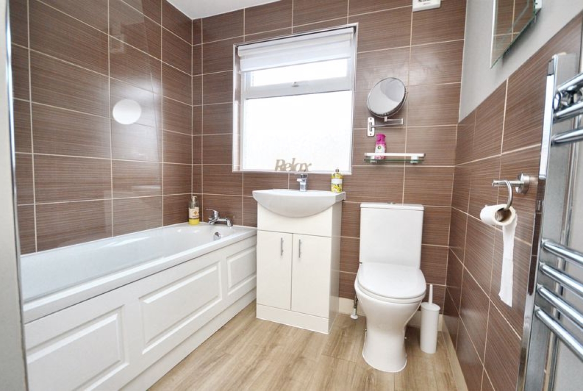 Panelled bath with mains shower and glass shower screen | Cabinet with integrated wash-hand basin | Close -coupled WC | Chrome ladder-style radiator | Part-tiled walls | Extractor fan | UPVC double-glazed frosted window with fitted blind | Storage cupboard housing gas boiler | Vinyl plank flooring