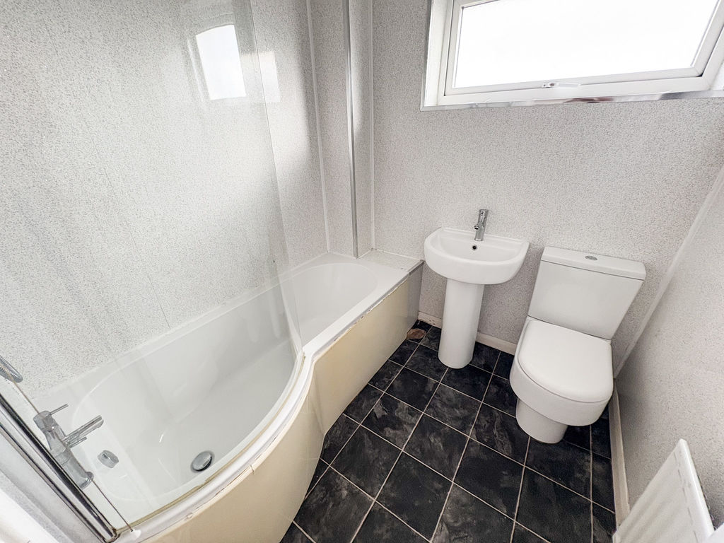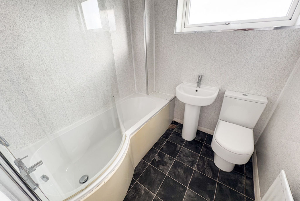FAMILY BATHROOM: Contemporary re-fitted bathroom suite comprising of, bath with hot and cold mixer taps, additional forest waterfall spray, pedestal washbasin, low level w.c, tile effect flooring, panelled walls, double glazed window, radiator.