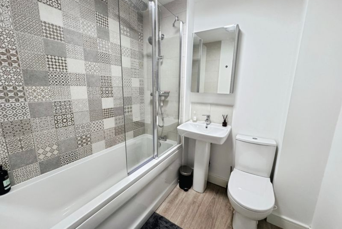 Bath with shower over, low level wc, wash hand basin, part tiled and heated towel rail.