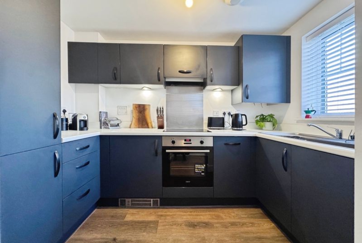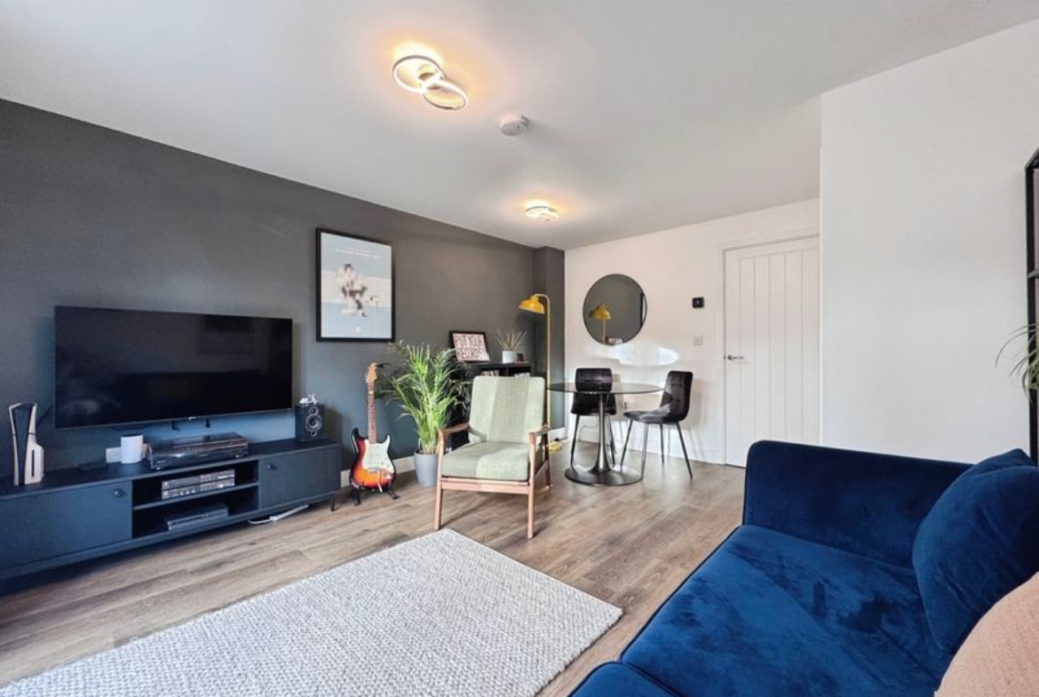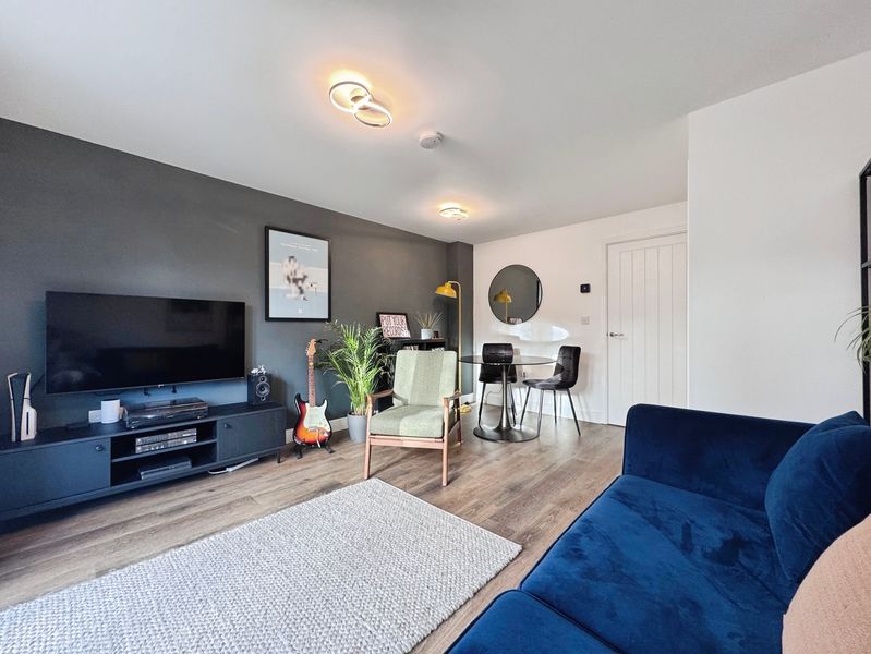 Inside, an inviting reception room offers well-planned living and dining space with direct access to the south-facing garden, creating a pleasant setting for relaxing and entertaining. The contemporary kitchen includes integrated appliances, keeping everything neat and practical. A useful downstairs WC adds extra convenience. Upstairs, you’ll find two double bedrooms, one benefiting from built-in wardrobes, along with a family bathroom featuring a shower over bath.