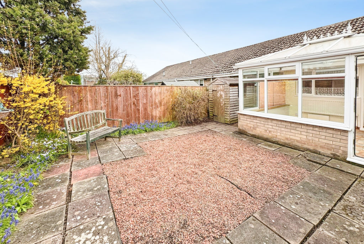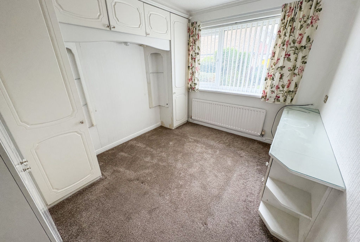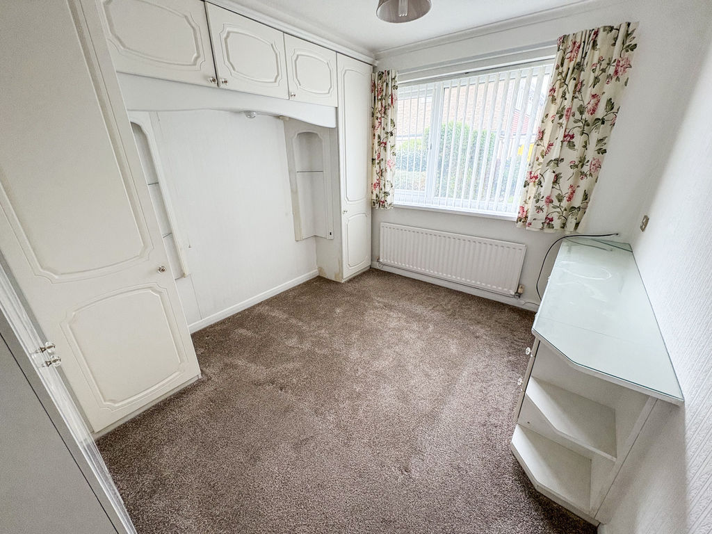 The bungalow briefly comprises an entrance porch leading into a welcoming lounge, a well-appointed kitchen, and a sun lounge extension that floods the home with natural light while offering views of the rear garden. The master bedroom is thoughtfully fitted with wardrobes and bedroom furniture, complemented by a modern shower room.
