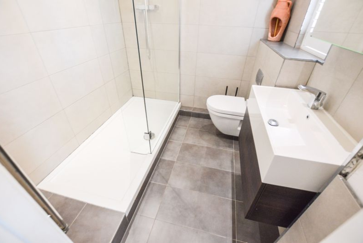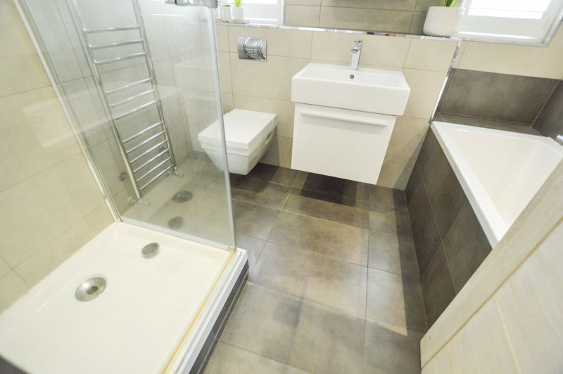 4 piece suite comprising: Panelled bath, wash hand basin set in vanity unit, shower cubicle, low level WC, double glazed window to rear, heated towel rail, tiling to walls, tiled flooring
