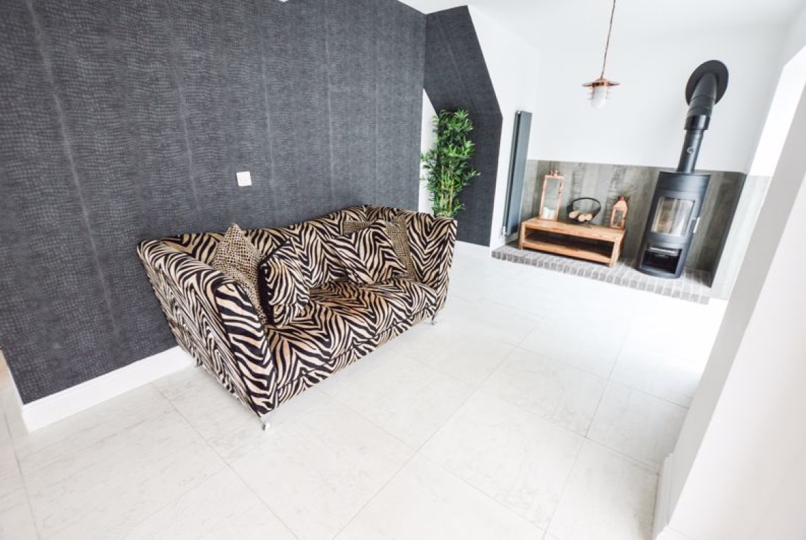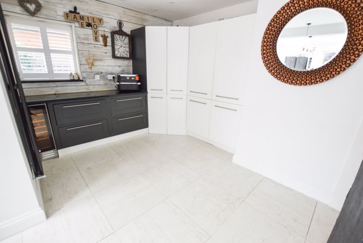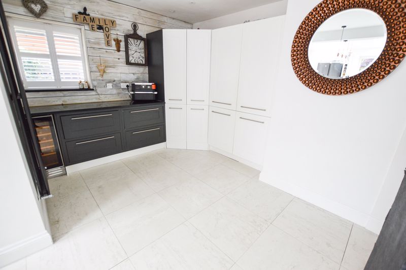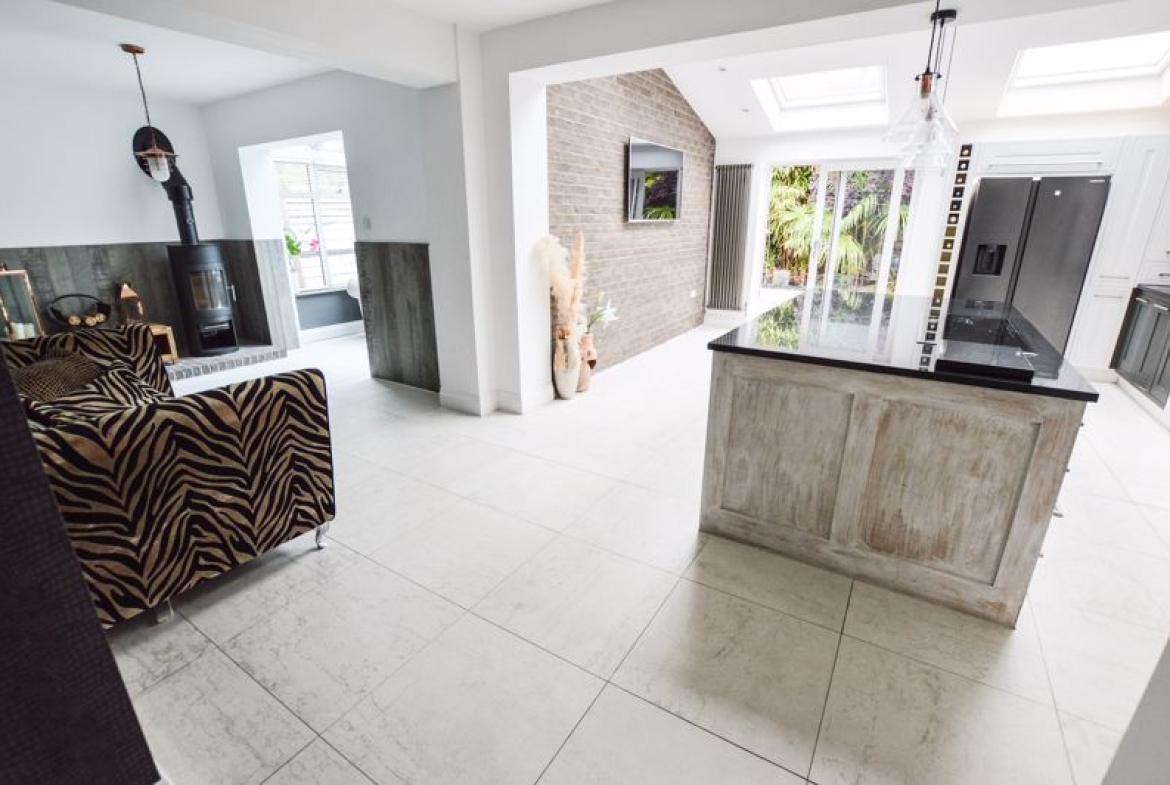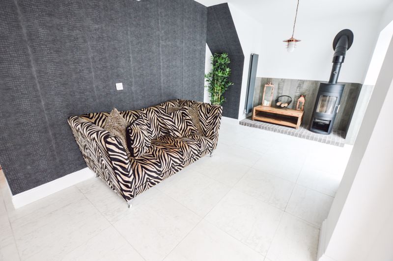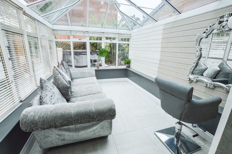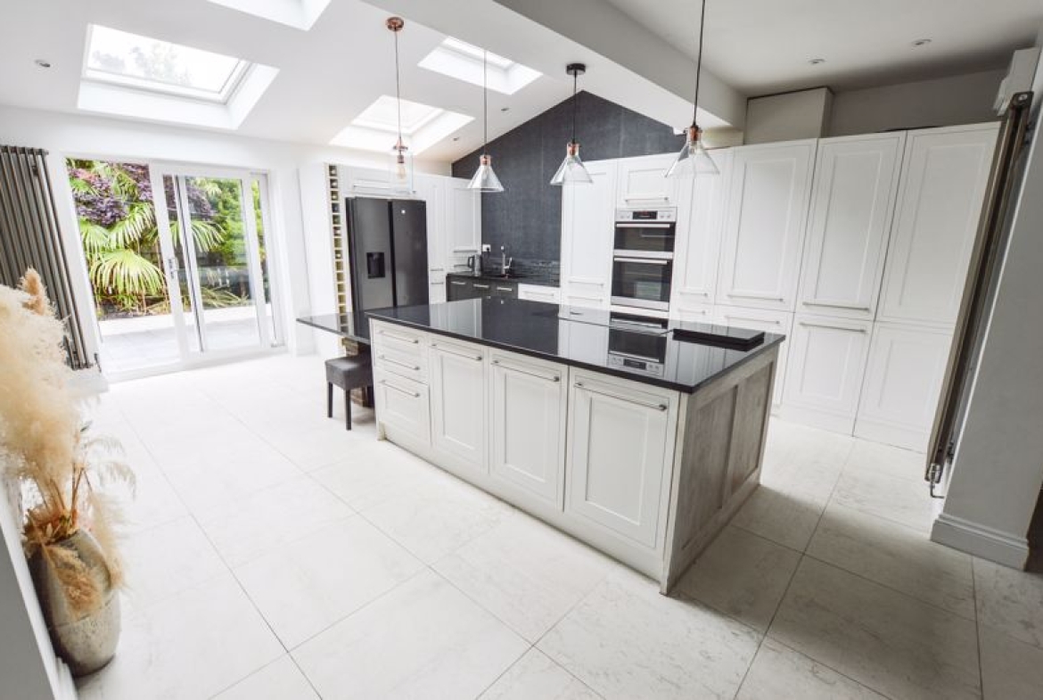 The main lounge provides a stylish yet tranquil space to relax, while the heart of the home is undoubtedly the spectacular party kitchen diner. This stunning space features a central island, perfect for entertaining, and flows beautifully into a versatile family area warmed by a log burner, creating a cosy yet sophisticated ambiance. The adjoining conservatory bathes the space in natural light and provides views over the landscaped garden, ideal for both everyday living and hosting guests. Practicality is not forgotten, with a well-appointed utility area and a sleek downstairs W.C. offering convenience and function.