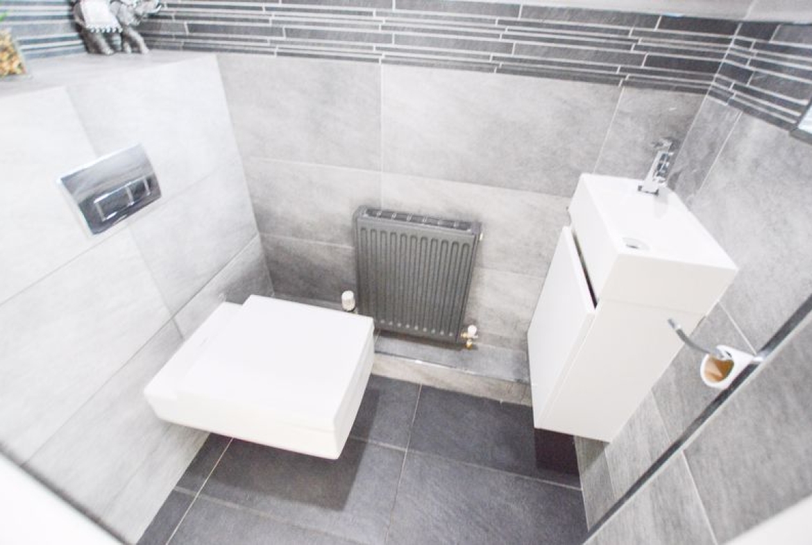 Low level WC, wash hand basin set in vanity unit, double glazed window, tiling to walls and floor, single radiator