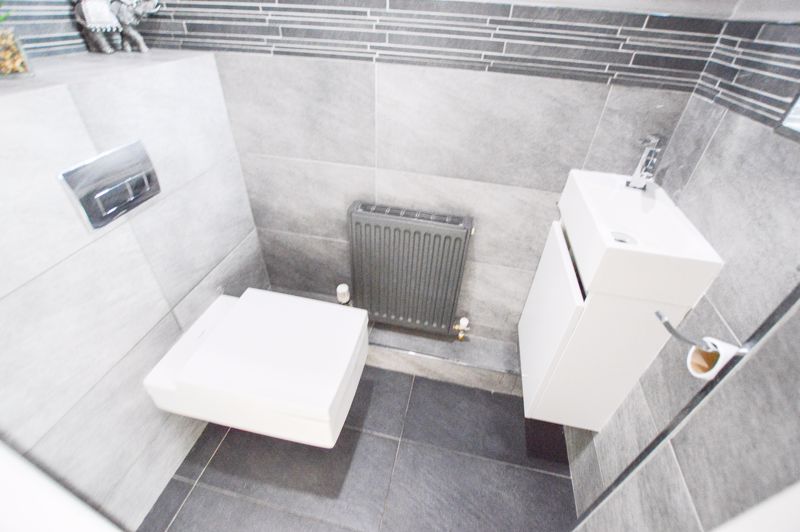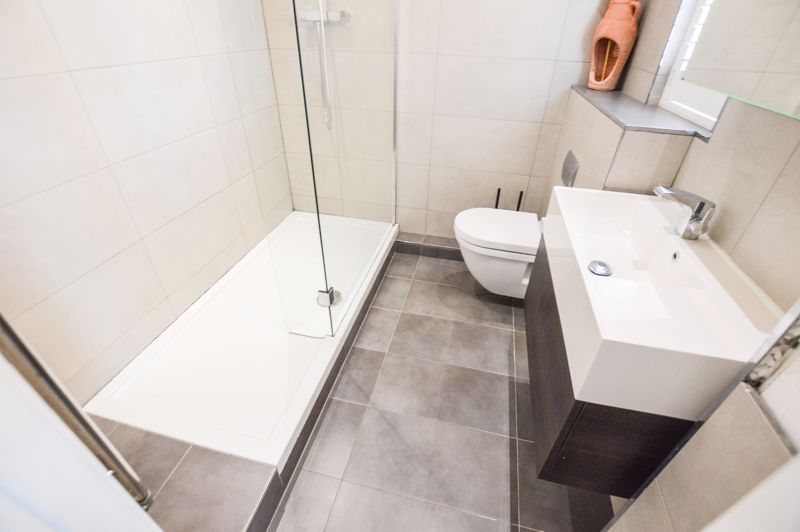 Double glazed window to front, low level WC, wash hand basin set in vanity unit, shower cubicle, tiling to walls, heated towel rail, spot lights, tiling to floor