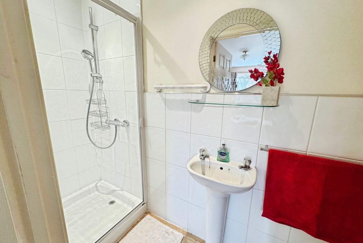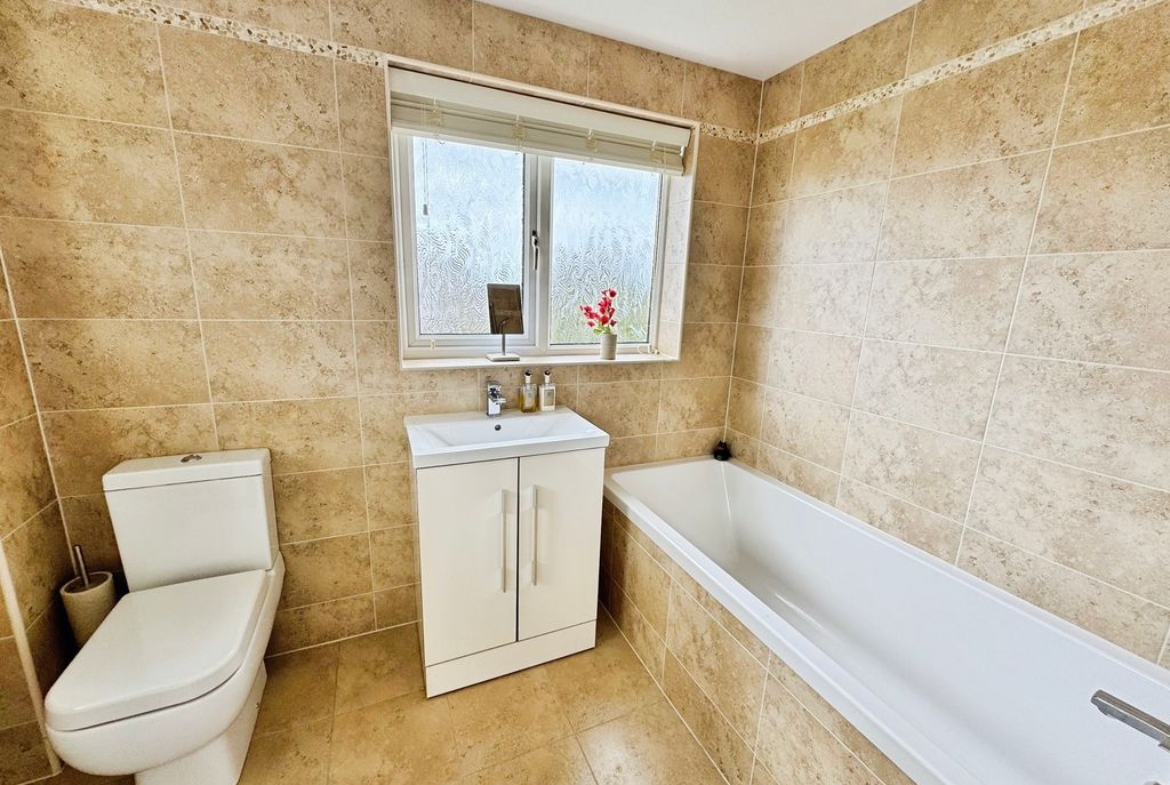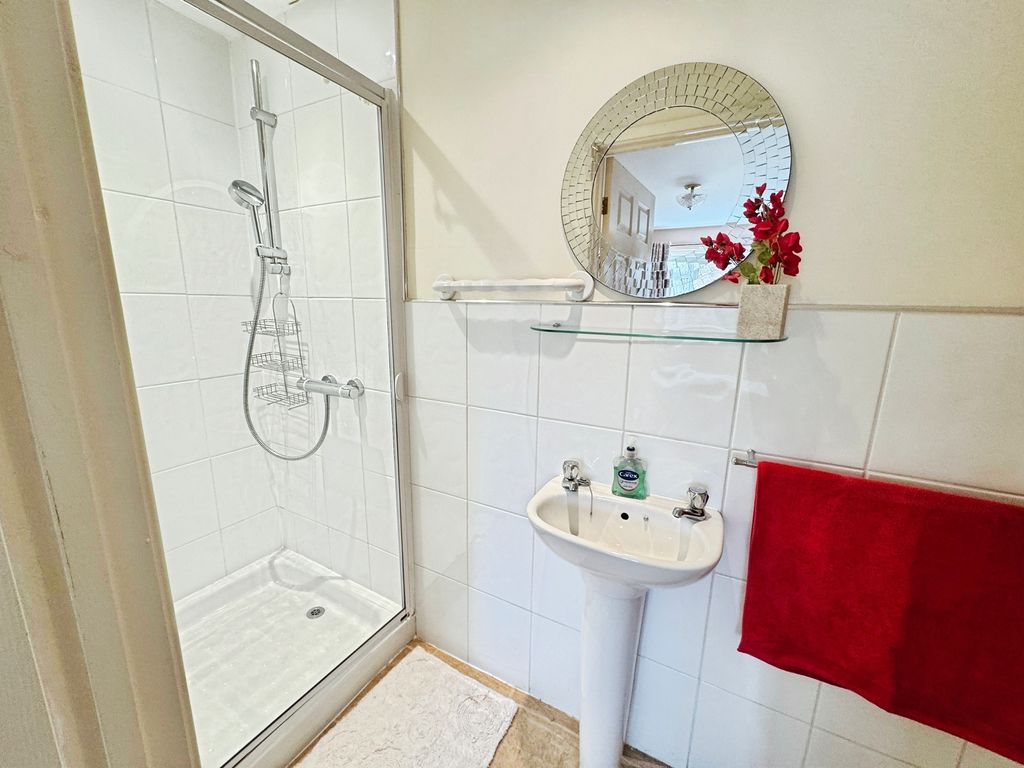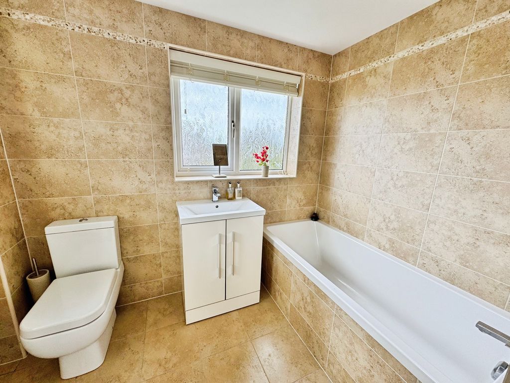 Two UPVC windows, bath with shower, wc, vanity wash hand basin, fully tiled and heated towel rail.