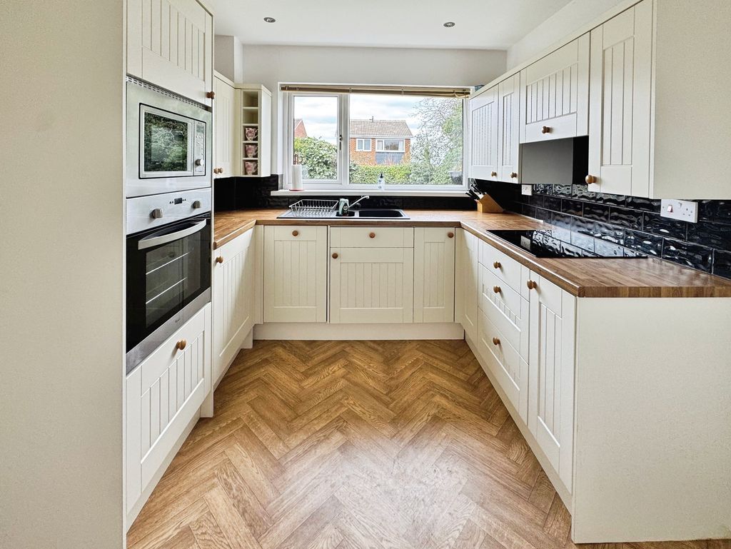 UPVC window, access to garage, fitted with a range of matching wall and base units with worksurfaces above incorporating one and a half bowl sink unit with drainer, tiled splash backs, integrated electric hob, electric oven, extractor hood, integrated microwave, dishwasher, fridge freezer and two built in cupboards.
