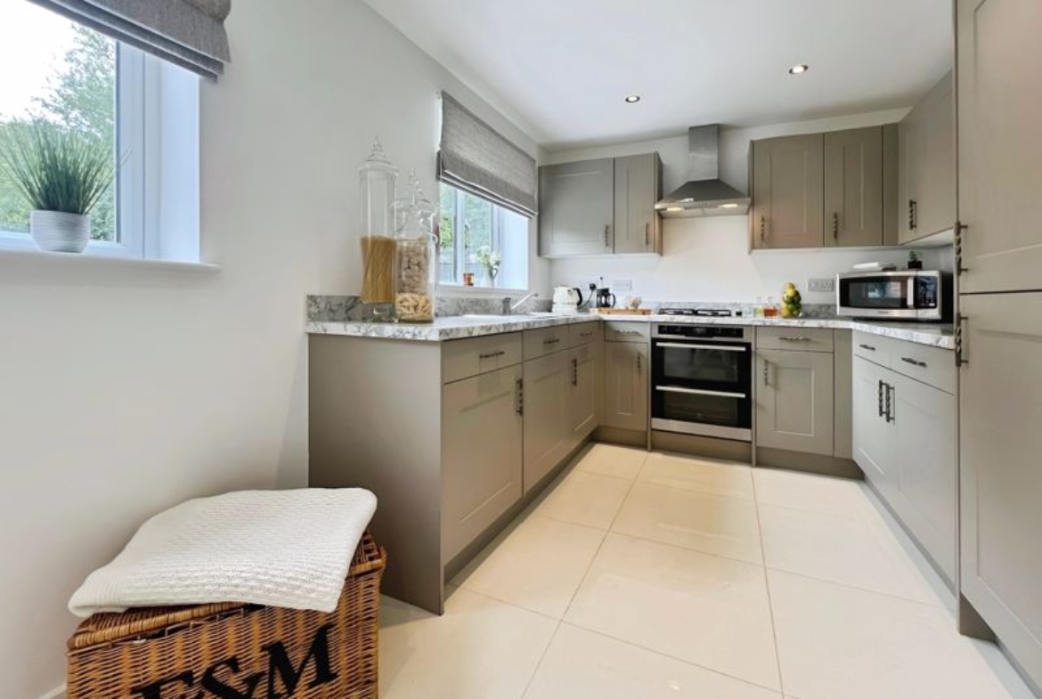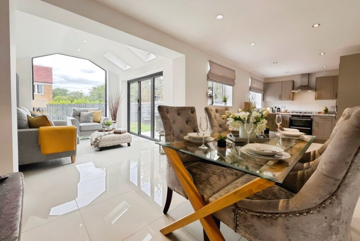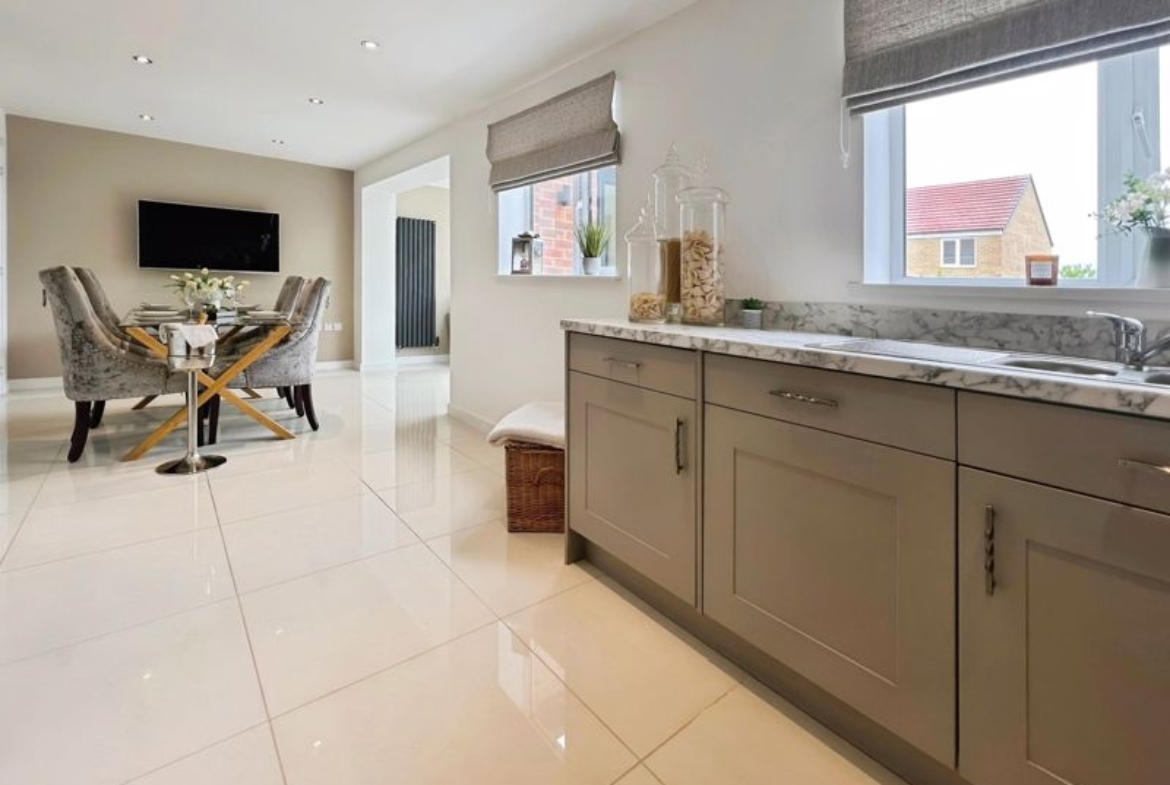 The heart of the house is a modern, open-plan kitchen awash with natural light, offering ample dining space for family meals. The kitchen’s modern finish adds a touch of elegance and style to the home.
