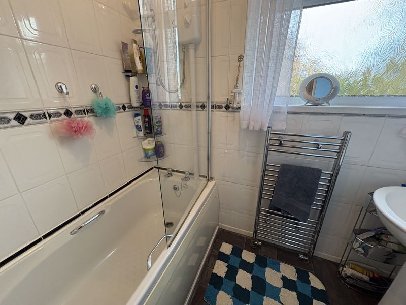 Comprising of: Panelled bath with electric shower over and glass screen. Pedestal wash hand basin, heated towel rail. Built in cupboard, double glazed window to the rear.