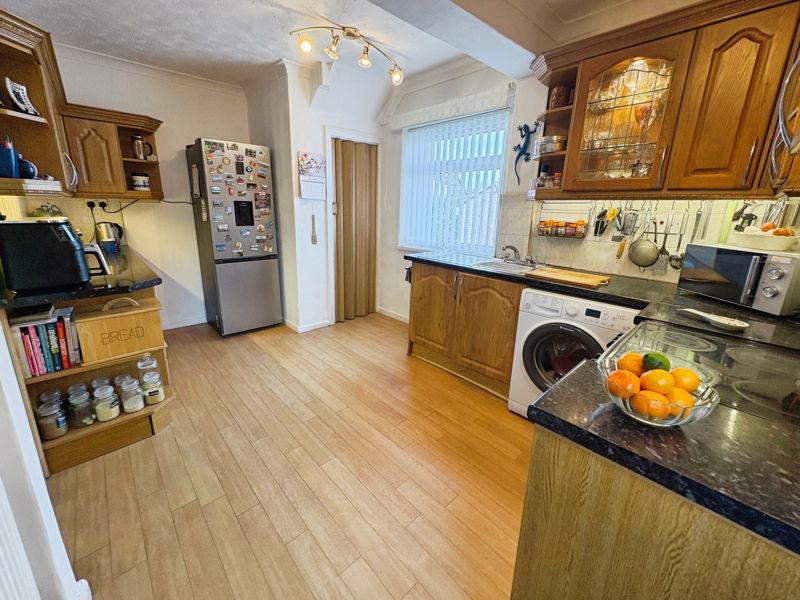 Fitted wall and base units with work surfaces incorporating; single drainer sink unit with mixer tap, space for free standing cooker, washing machine, fridge freezer and dryer. Cupboard housing combi boiler and pantry. Double glazed window and door to side.