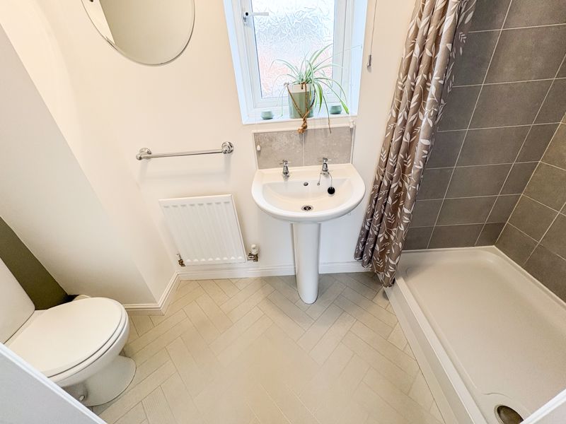 EN-SUITE SHOWER ROOM: double glazed window to rear, low level WC, hand basin, single radiator, shower cubicle, and part tiling to walls.