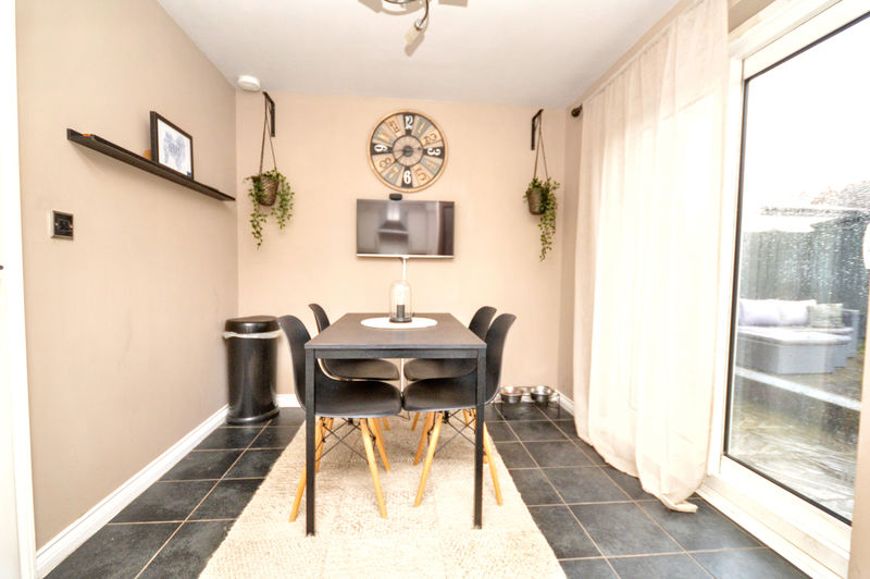 The ground floor includes a living room to the front, and a dining room at the rear that is open to the kitchen and has doors out to the rear garden, creating a sociable layout for everyday living and entertaining. A downstairs W.C. off the entrance vestibule adds convenience. On the first floor there are three bedrooms served by a main family bathroom.