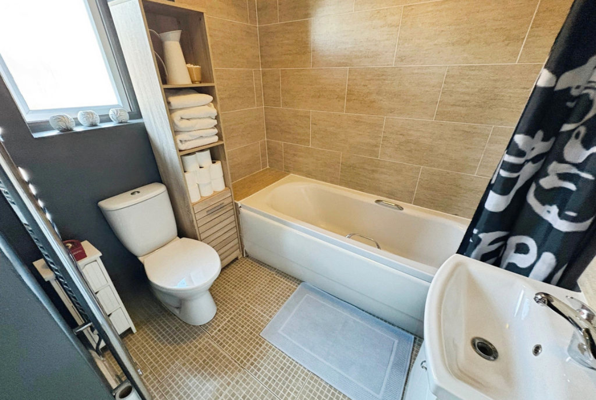 FAMILY BATHROOM: White three piece suite comprising panelled bath with electric shower over wash hand basin set in vanity unit, low level w.c, part tiled walls, heated towel rail, double glazed frosted window to side