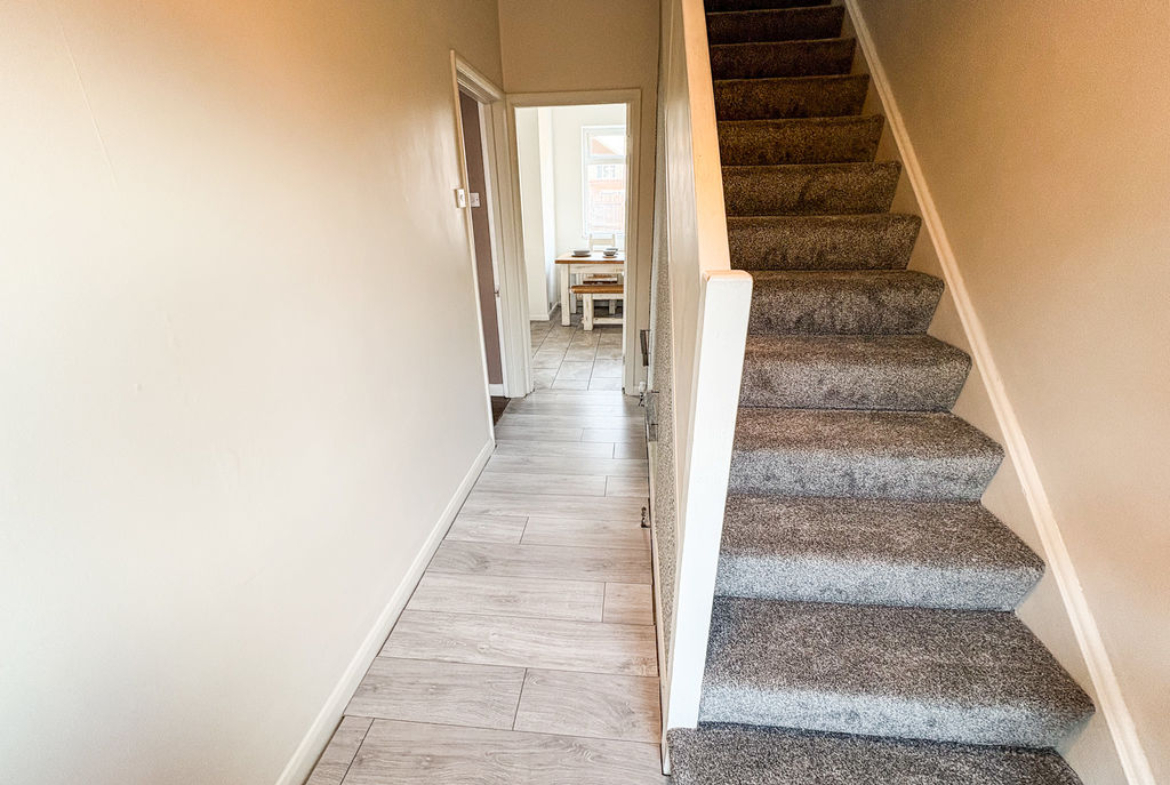 ENTRANCE HALLWAY: Double glazed entrance door, staircase to first floor, laminate flooring, and radiator.