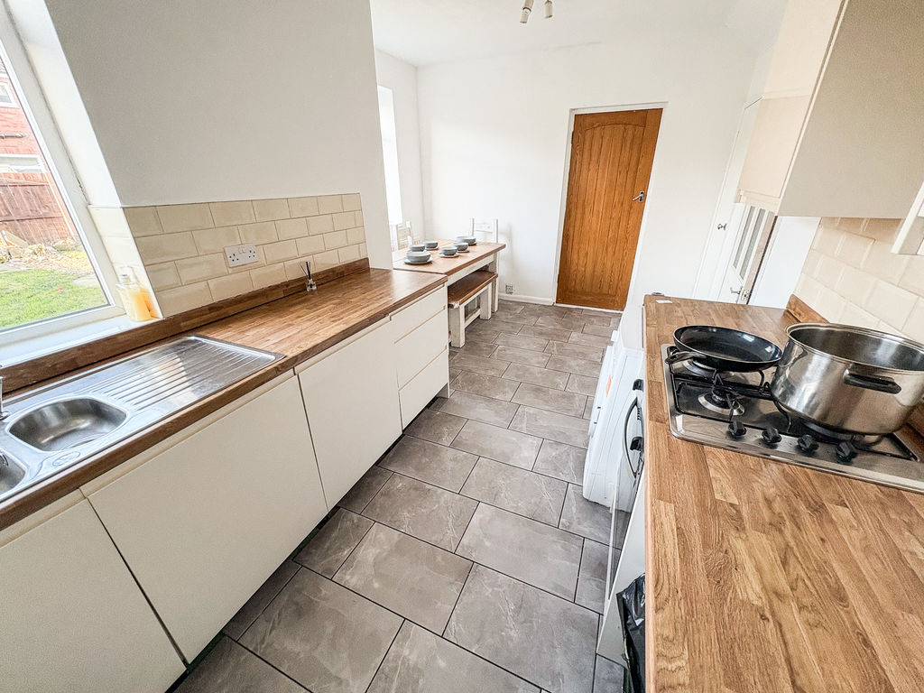 Fitted with a range of wall and base units, work surfaces, 1.5 bowl sink unit, built in electric oven and gas hob, extractor hood, space for fridge freezer, tiled splash back, built in cupboard, radiator, tiled floor, and double glazed window to rear x 2. Door to utility.