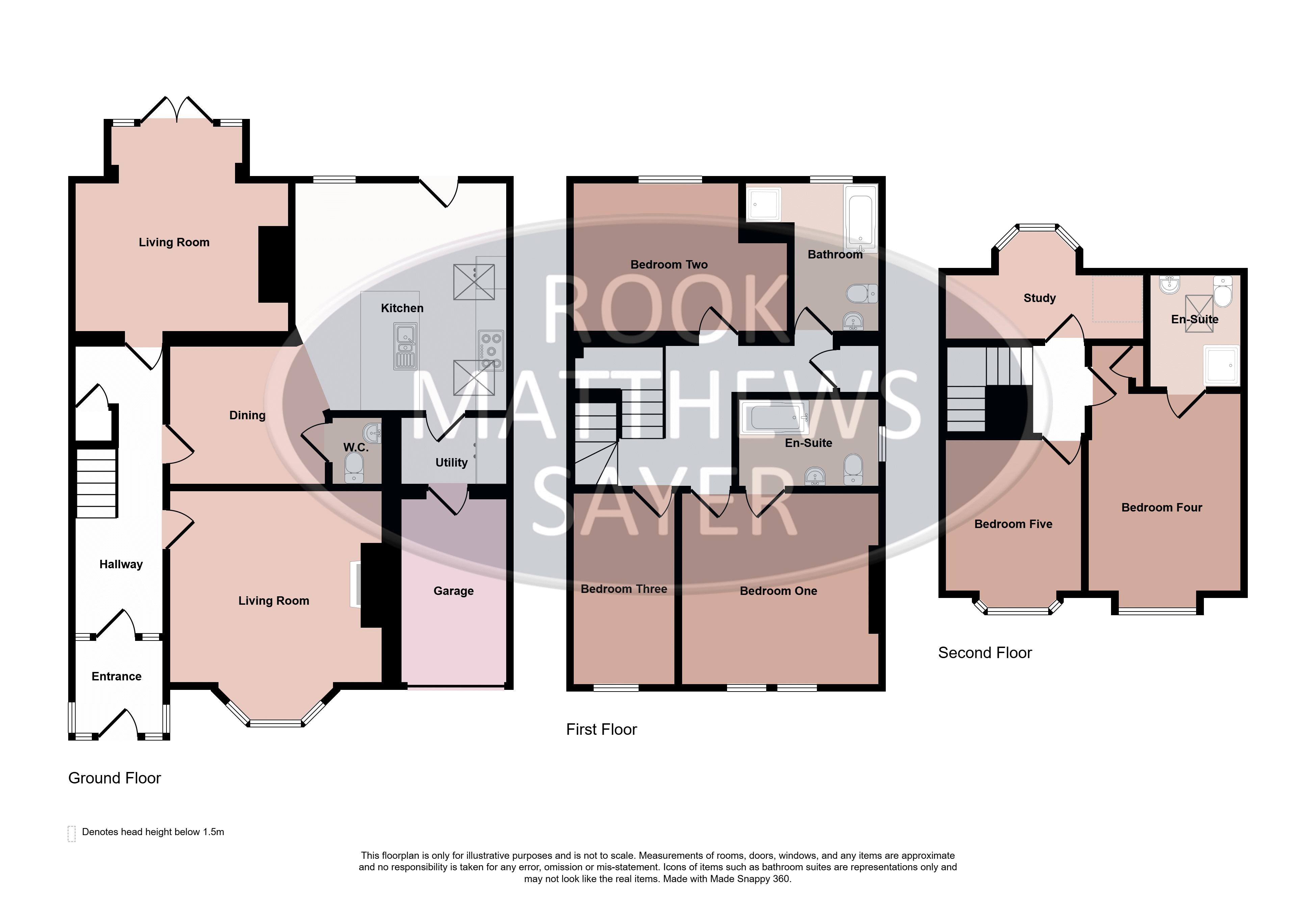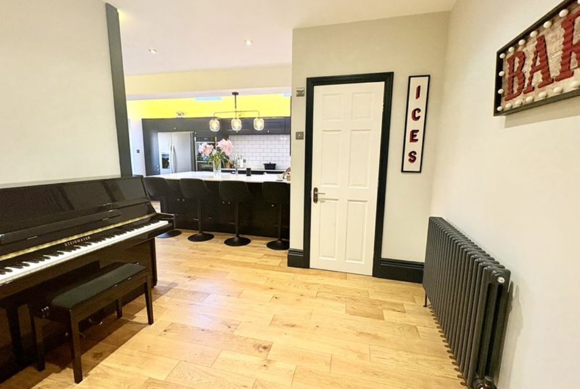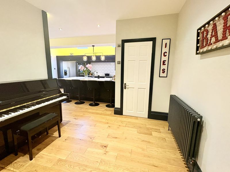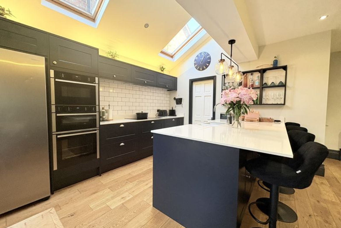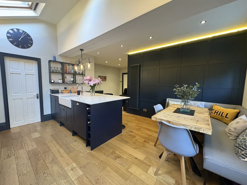 An exceptional and beautifully presented five bedroom home, offering generous and versatile accommodation arranged over three impressive floors. Finished to a high standard throughout, this stunning property perfectly blends elegant character with contemporary design, creating an ideal home. The ground floor opens with a welcoming entrance hallway which immediately sets the tone with its sense of space and quality. To the front is a superb formal living room, flooded with natural light from the bay window and enhanced by a feature fireplace and classic detailing. A second reception room to the rear provides a relaxed space with views across the garden and direct access outdoors. At the heart of the home lies the outstanding open-plan kitchen. Beautifully designed, this striking space features a large central island, sleek contemporary units, integrated appliances and skylights which fill the room with natural light. It offers the perfect setting for both everyday life and entertaining on a larger scale. A separate utility room provides excellent practicality, along with internal access to the garage, while a stylish ground floor WC completes the level. The first floor offers three generous bedrooms, including an elegant principal bedroom with a modern en-suite bathroom. The remaining bedrooms are served by a spacious family bathroom. The second floor continues the theme of space and flexibility, providing two further bedrooms, a separate study and a beautifully appointed shower room en-suite. Externally, the property enjoys a private driveway and an integral garage. To the rear is a delightful enclosed garden, featuring a paved patio area for outdoor dining and a well-maintained lawn, perfect for both relaxation and entertaining. This outstanding home offers an exceptional level of space, style and functionality, making it a truly impressive property in a highly desirable residential location. Freehold, EPC: D, Council Tax Band: D, Electricity, Water, sewerage, heating mains, broadband: FTTP, Mobile coverage blackspot: No