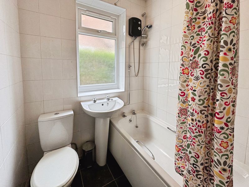 Bath with shower, low level wc, wash hand basin, storage, fully tiled and radiator.