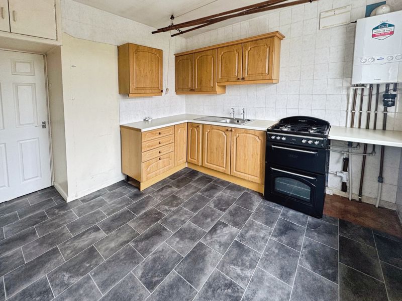 UPVC window, fitted with a range of matching wall and base units with work surfaces above incorporating stainless steel sink unit with drainer, free standing cooker, plumbed for washing machine, dining space and radiator.