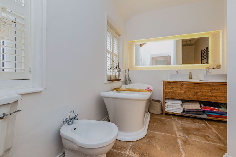 Two sash windows, free standing bath, large walk in rainfall shower, low level wc, his and hers vanity wash hand basis, bidet, under floor heating and heated towel rail.