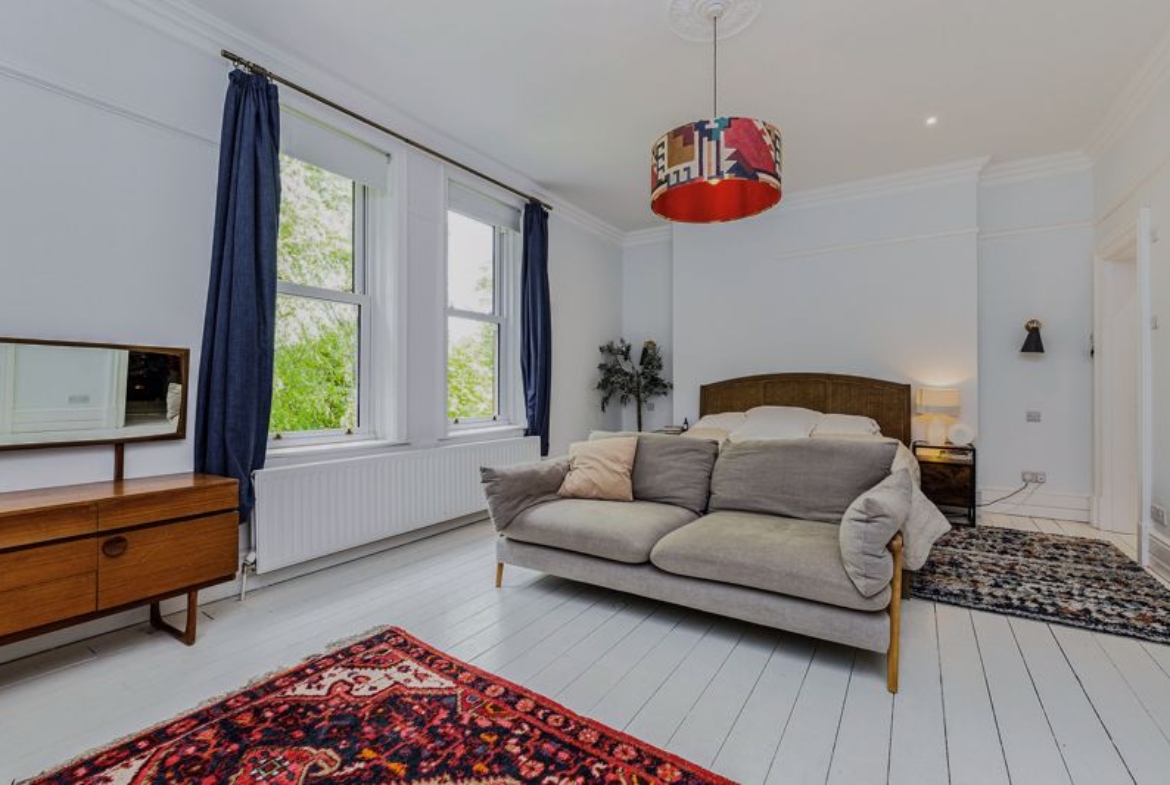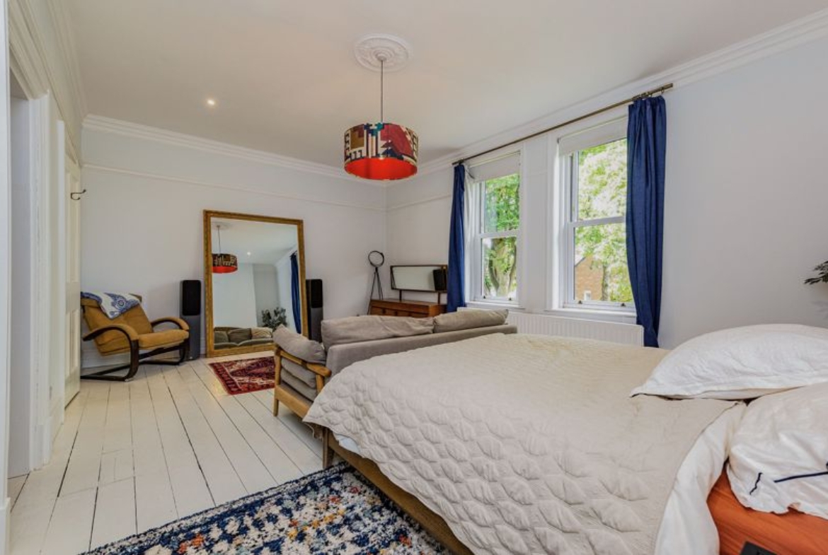 Two sash windows, walk in wardrobes, solid wood flooring and radiator.