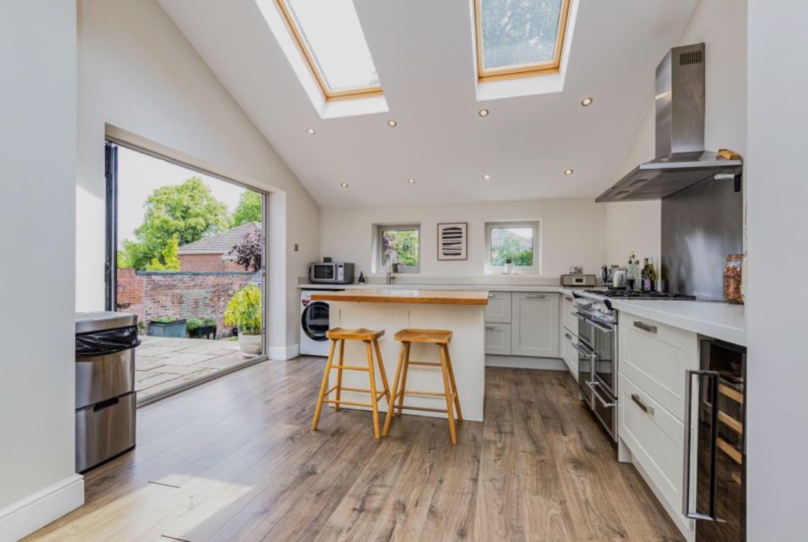 Two skylights, ash window, two further windows, Bi-fold doors, fitted with a range of tall matching wall and base units with work surfaces above incorporating one and a half bowl sink unit with drainer, Range style cooker, wine cooler, integrated dishwasher, kitchen Island, pantries and two vertical radiators.