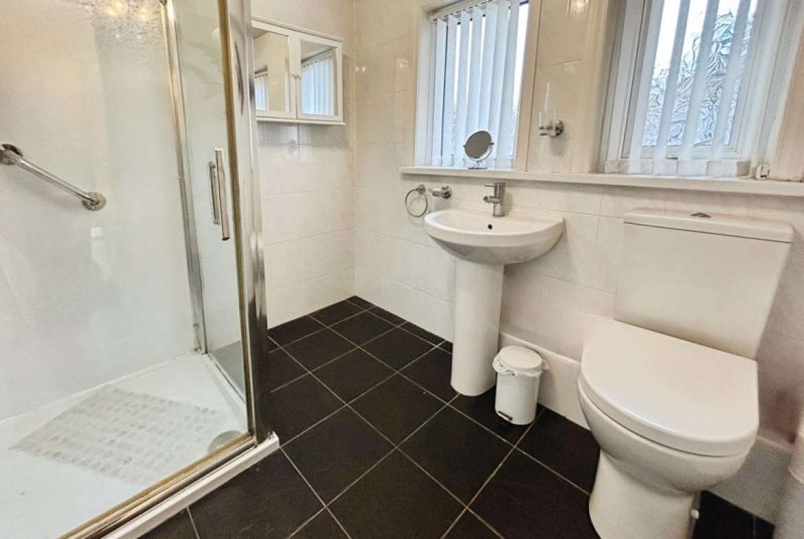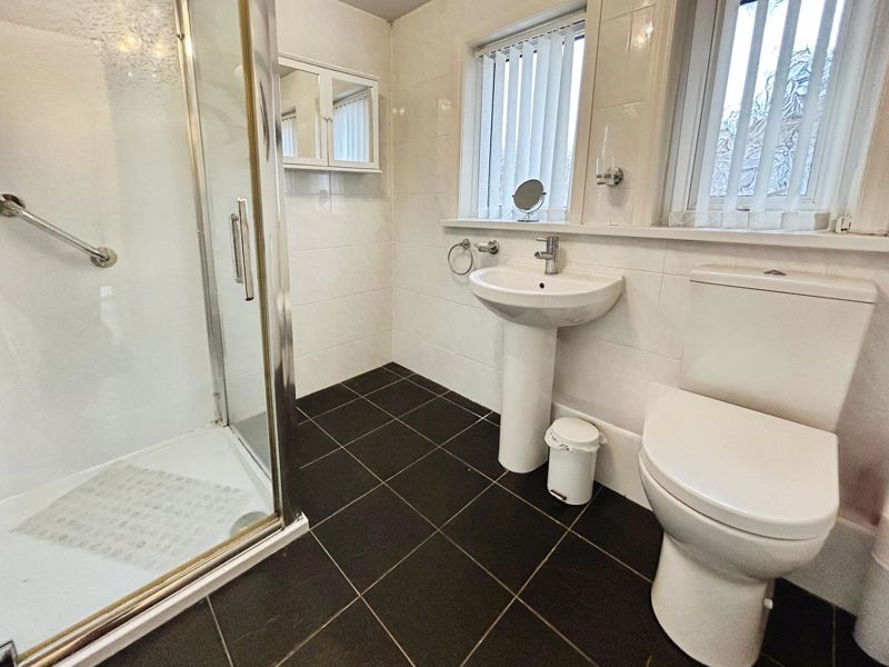 Briefly comprising; low level W.C., step in shower cubicle, pedestal wash hand basin, radiator, two UPVC double glazed frosted window to side.