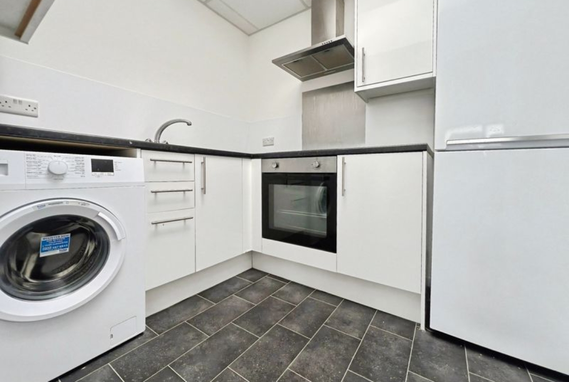 The flat benefits from a spacious reception room, enhanced by large windows that allow for plenty of natural light. This area provides ample space for both relaxation and entertaining guests. The property features one modern kitchen, equipped with quality white goods, a skylight, and generous natural light, creating a bright and functional space perfect for preparing meals.