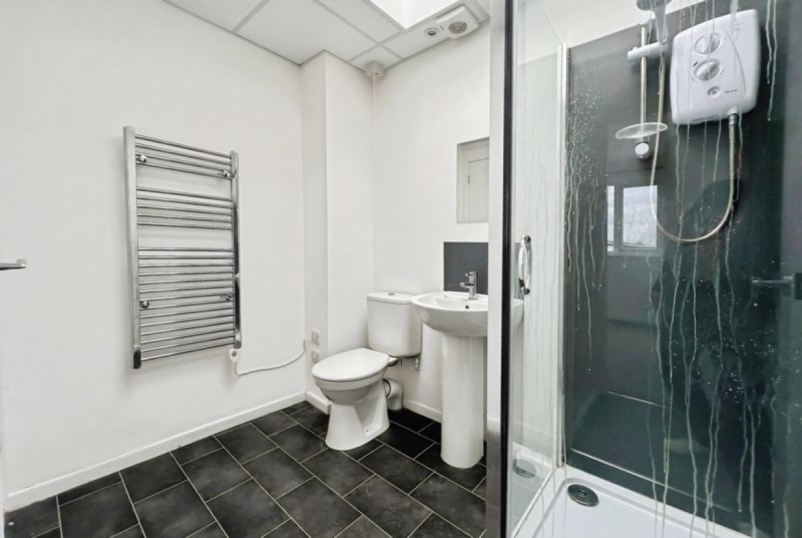 The flat benefits from a spacious reception room, enhanced by large windows that allow for plenty of natural light. This area provides ample space for both relaxation and entertaining guests. The property features one modern kitchen, equipped with quality white goods, a skylight, and generous natural light, creating a bright and functional space perfect for preparing meals.
