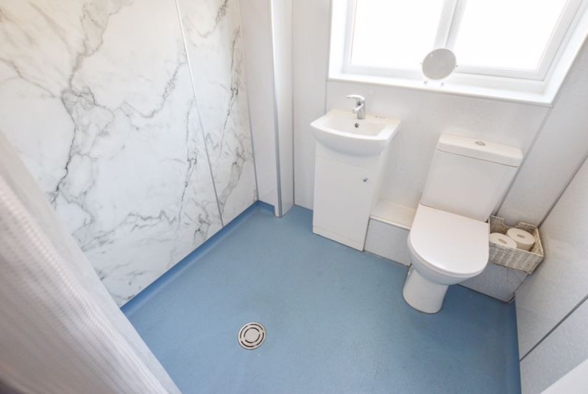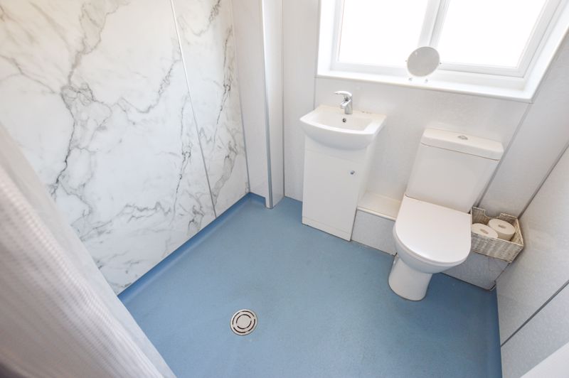 FAMILY BATHROOM: wash hand basin (set in vanity unit), low level w.c, and double glazed windows to rear, heated towel rail and wet room.