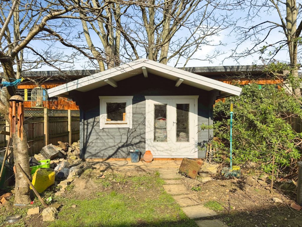 Externally, the property enjoys gardens to both the front and rear, mainly laid to lawn with mature borders. The rear garden features a raised patio area and a substantial detached timber structure, ideal for use as a playhouse, home office or garden room.