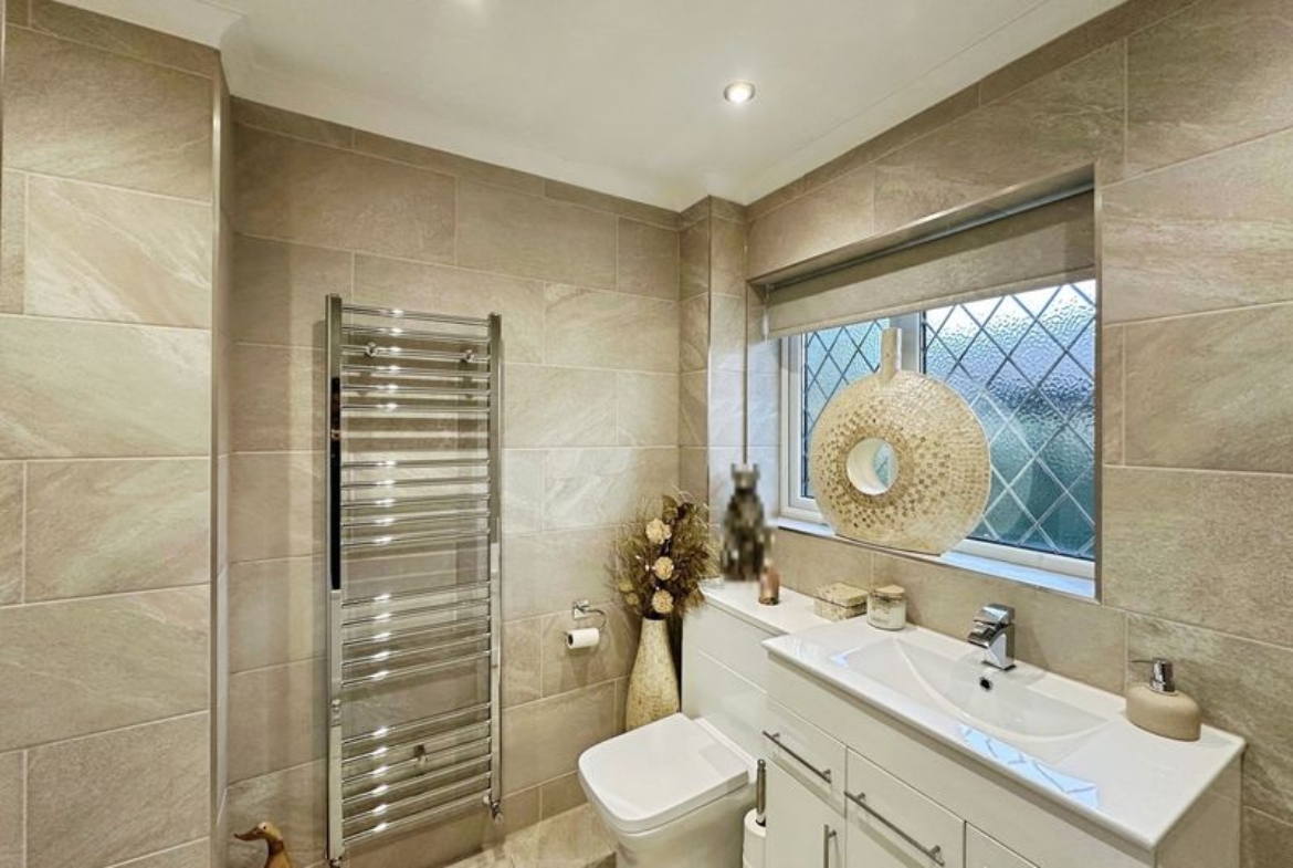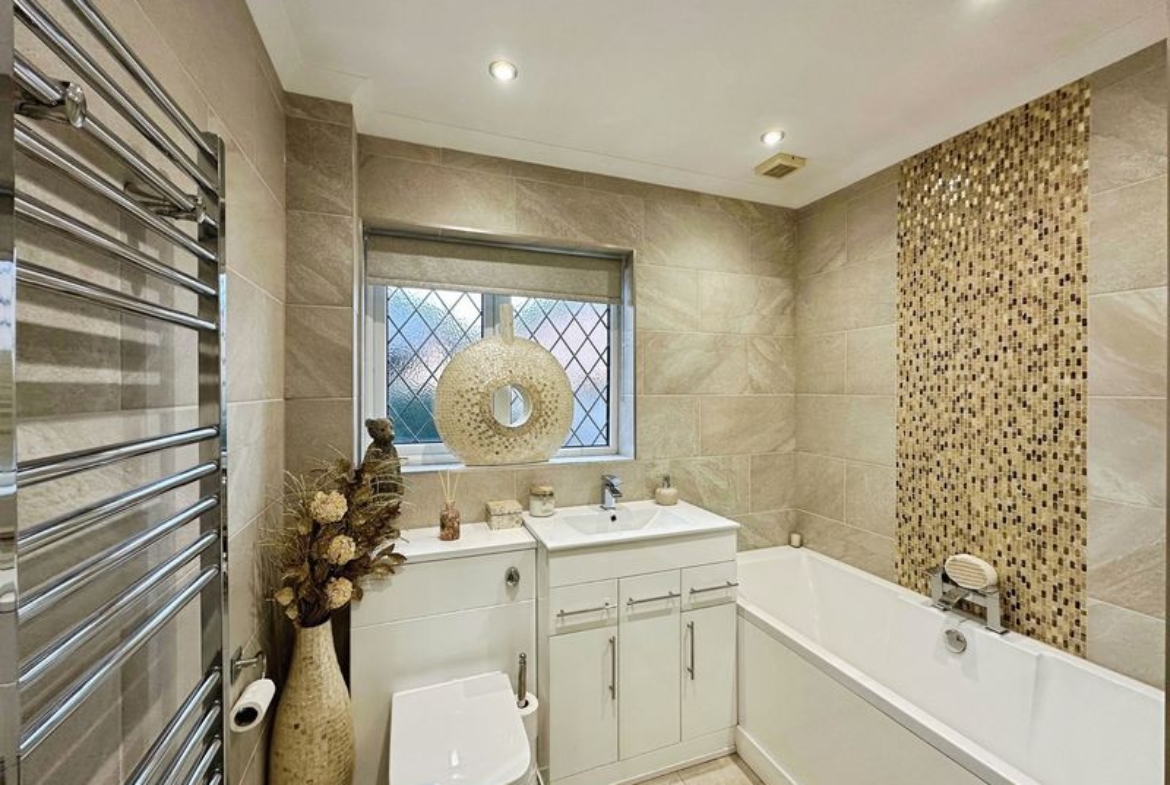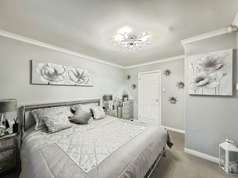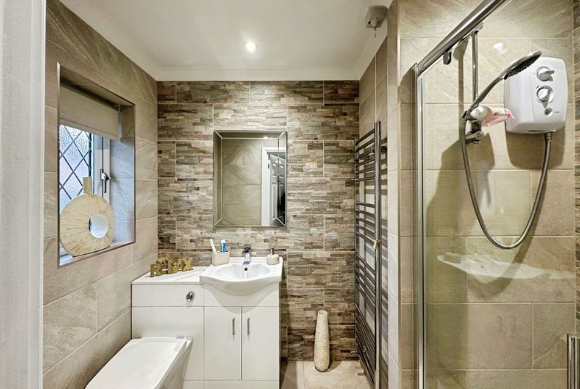 There are three double bedrooms. The master bedroom and second bedroom have been fitted with carpet, finished with modern décor and come with fitted wardrobes.  The master bed further benefits its own en-suite shower room. The third bedroom is currently used as a dining room but could easily be converted back to a bedroom. The family bathroom has been finished to a high standard, fully tiled and fitted with W.C., hand basin and bath tub.