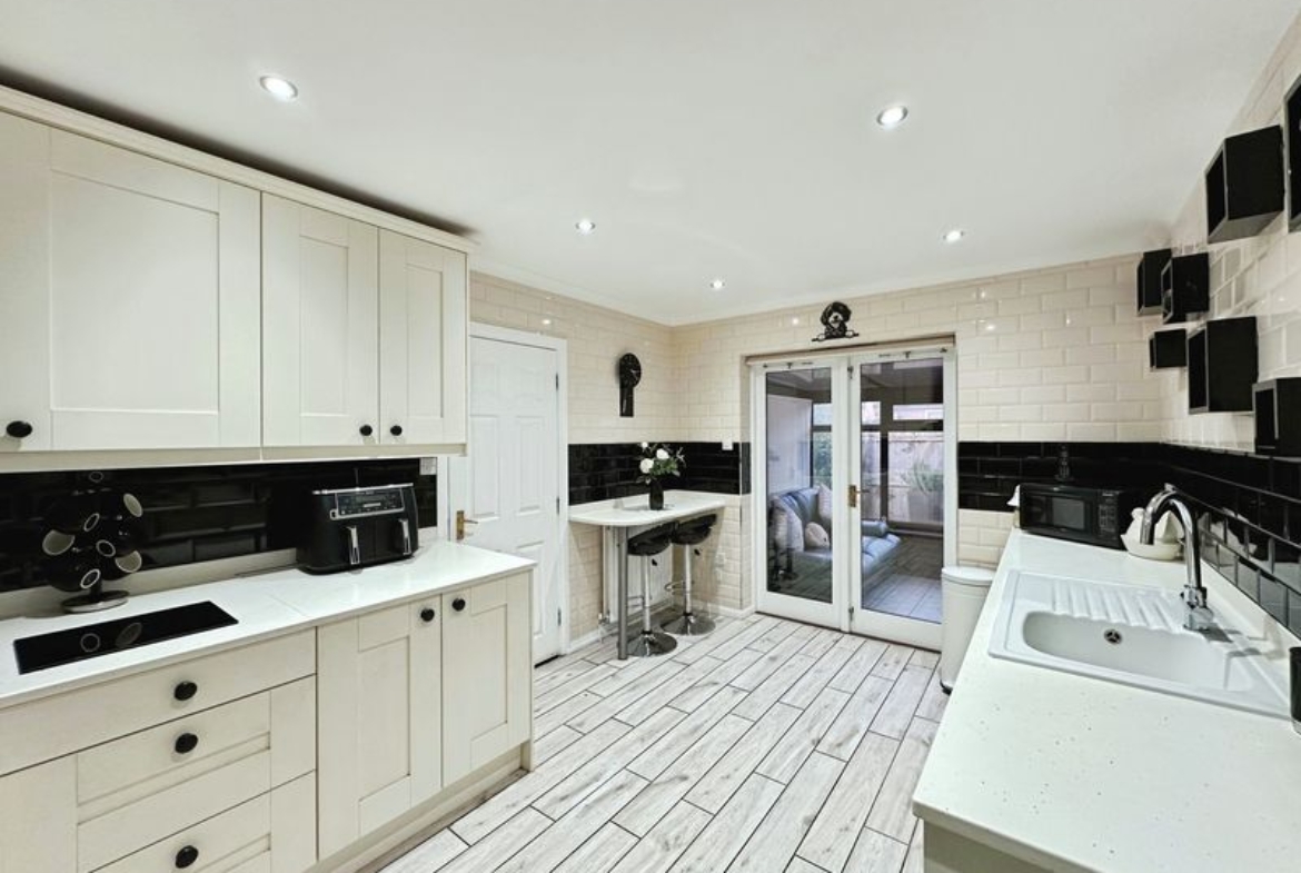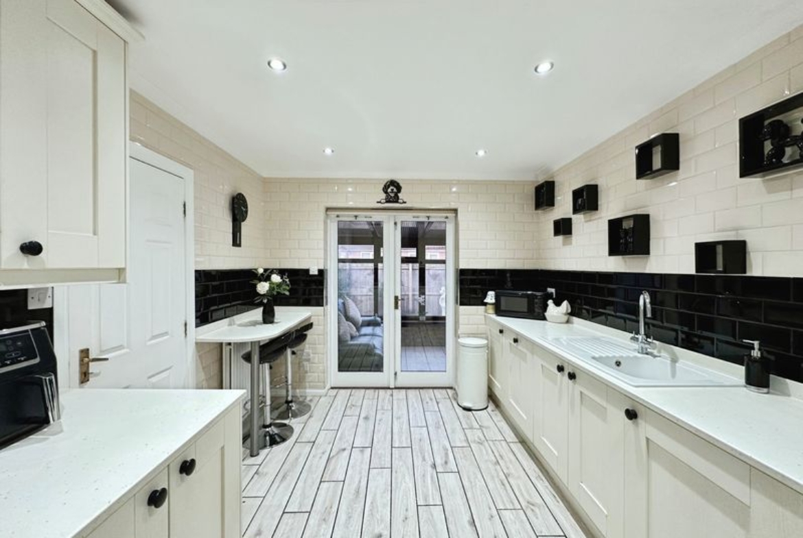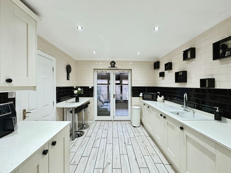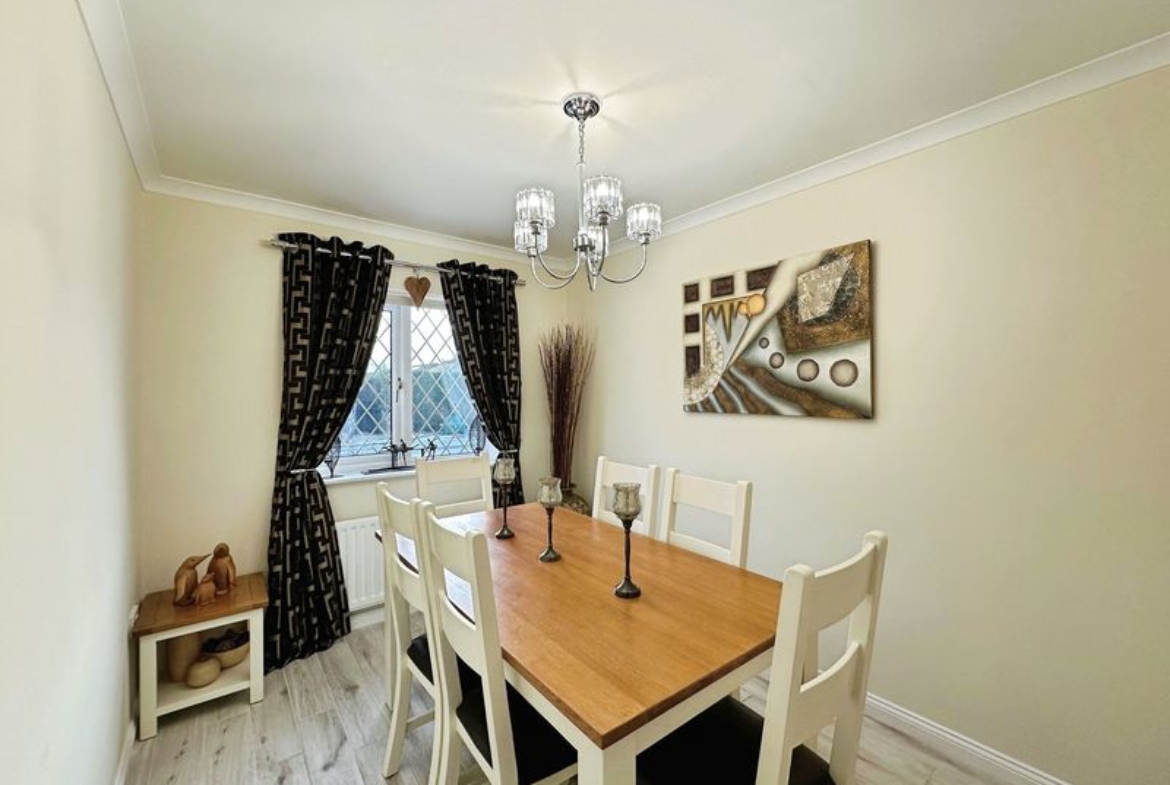 There are three double bedrooms. The master bedroom and second bedroom have been fitted with carpet, finished with modern décor and come with fitted wardrobes.  The master bed further benefits its own en-suite shower room. The third bedroom is currently used as a dining room but could easily be converted back to a bedroom. The family bathroom has been finished to a high standard, fully tiled and fitted with W.C., hand basin and bath tub.