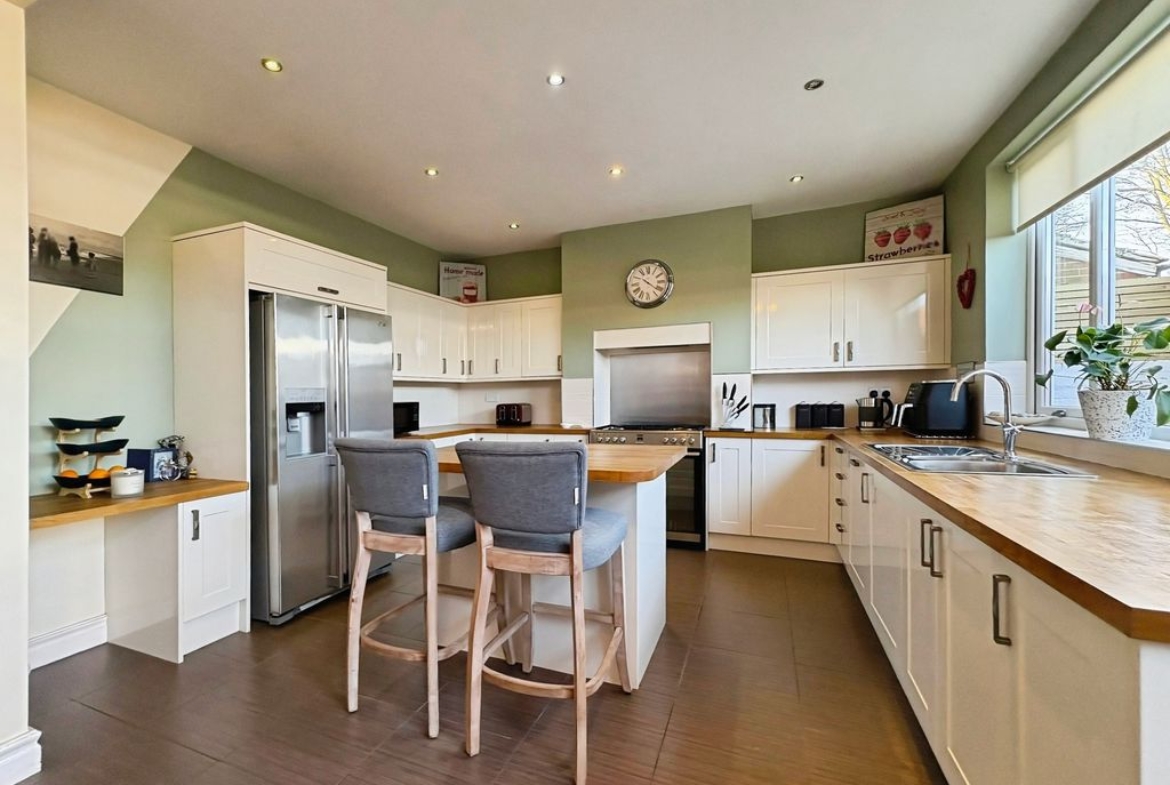 A well-balanced home with a full width driveway, generous room sizes and a superb dining kitchen. The ground floor opens into a welcoming hallway, leading through to a bright bay-fronted lounge with feature fireplace, while to the rear the property has been opened up to create a genuinely impressive dining kitchen. Fitted with a range of units, central island and ample space for both dining and day-to-day living, this is a room designed to be used and enjoyed, with direct access out to the rear yard. Upstairs, the property continues to offer well-proportioned accommodation, with three bedrooms including a spacious principal bedroom with fitted wardrobes, alongside a generous bathroom featuring both a corner bath and separate shower. Externally, the property is equally practical, with a block paved driveway to the front providing off-street parking, while to the rear there is a private, low maintenance yard with access to a detached garage, offering valuable storage or secure parking.