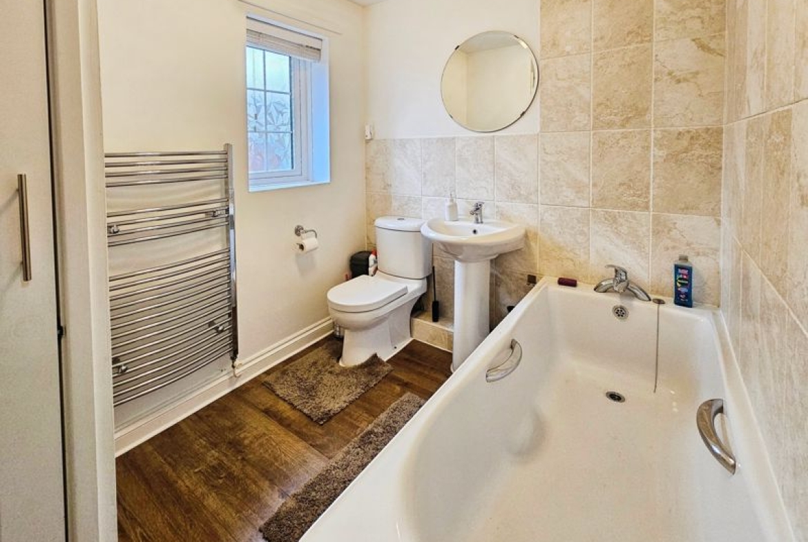 heated towel rail, part tiling to walls, laminate flooring, built in storage.