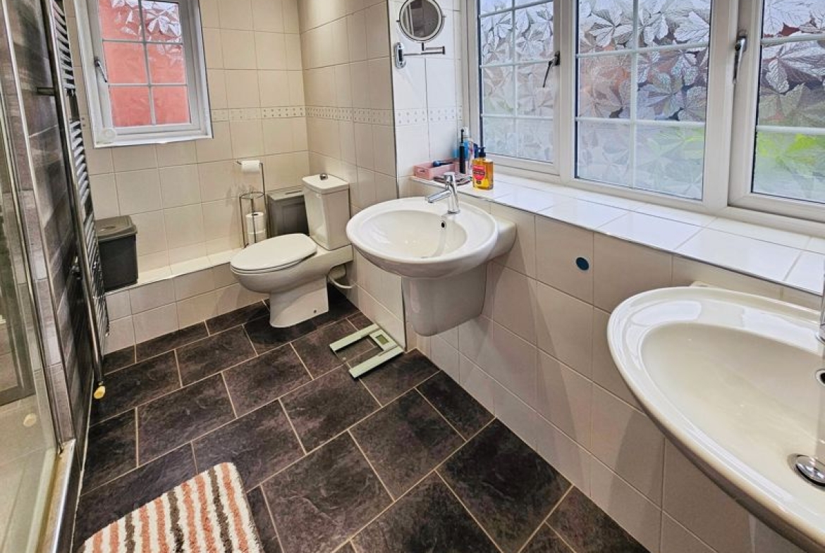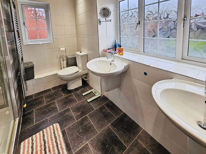 Double glazed window to front, single radiator, two pedestal wash hand basins, shower cubicle (mains shower), tiled walls, heated