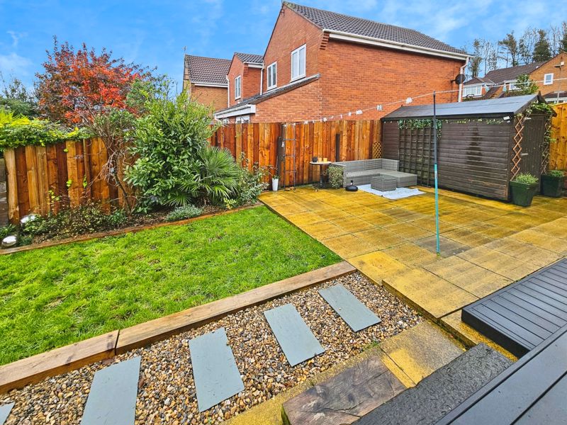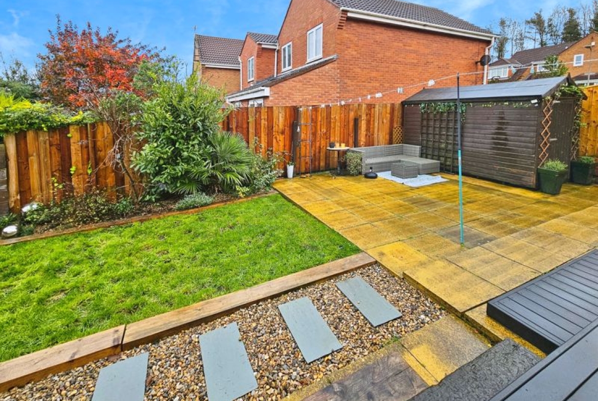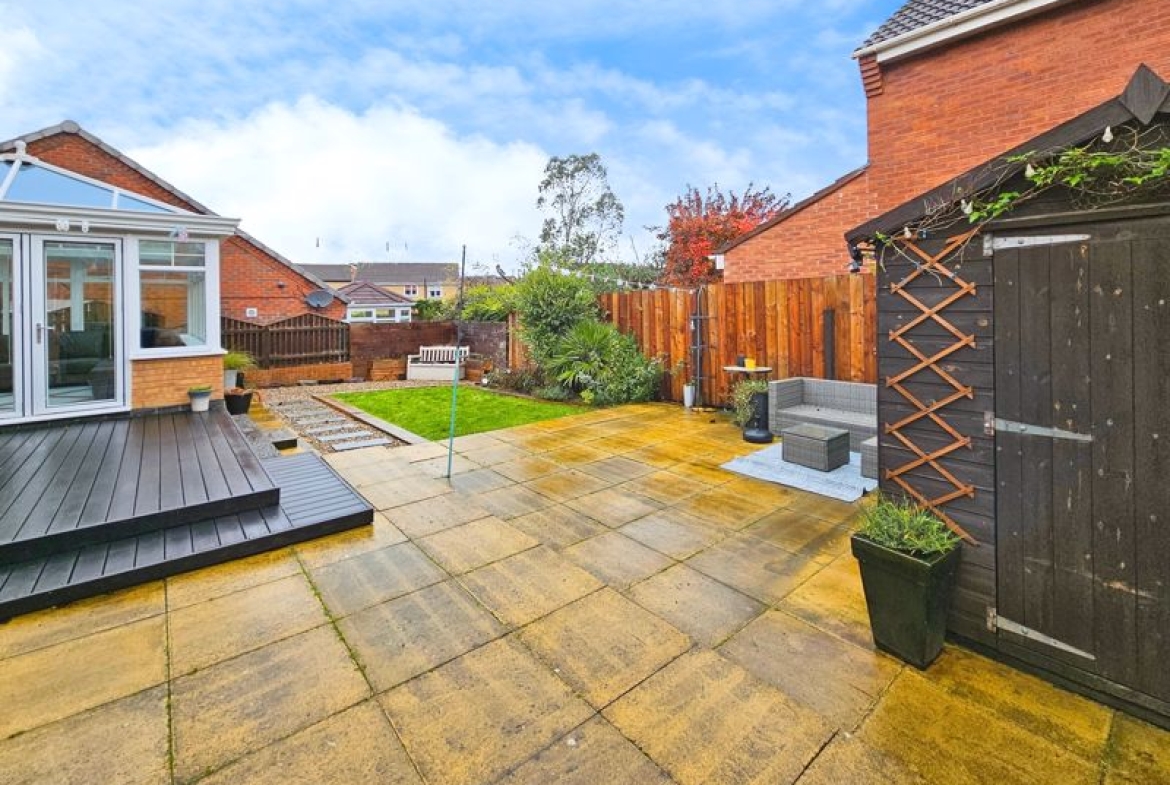 and decking area, flower beds, bushes and shrubs, garden shed.