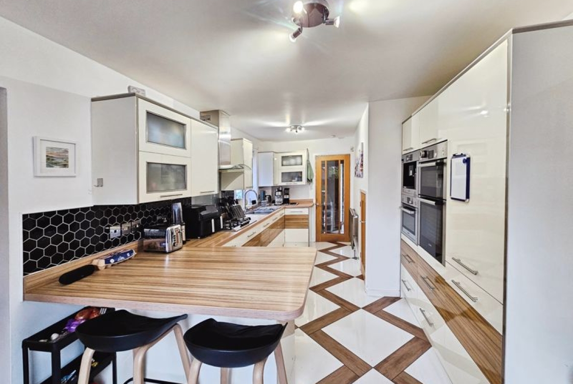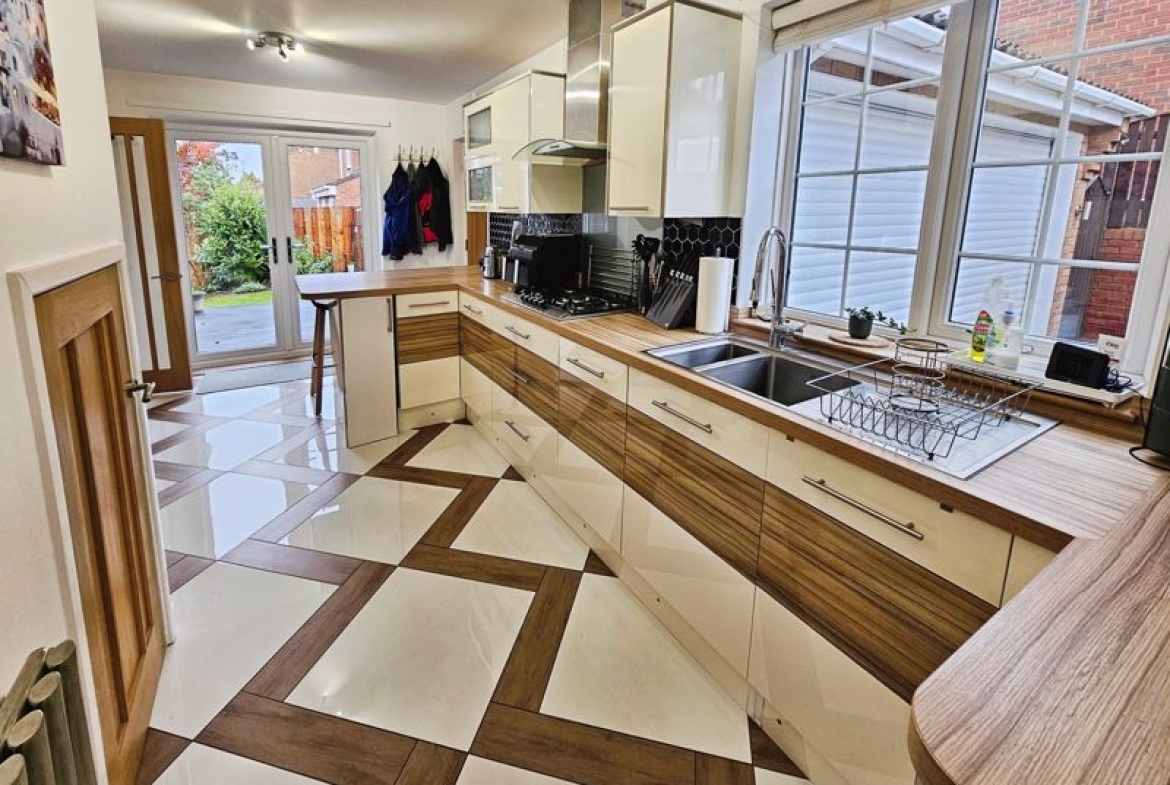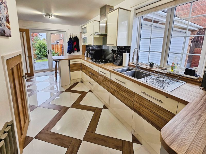 hob with extractor fan above, integrated fridge freezer, dishwasher, microwave and coffee machine, tiling to floor, double glazed