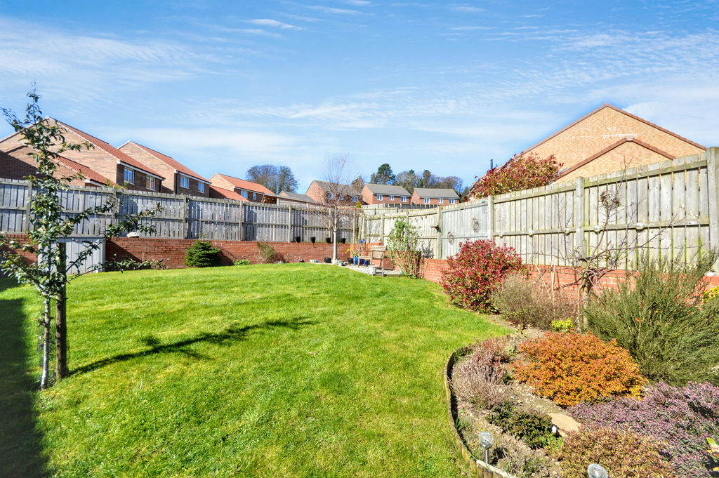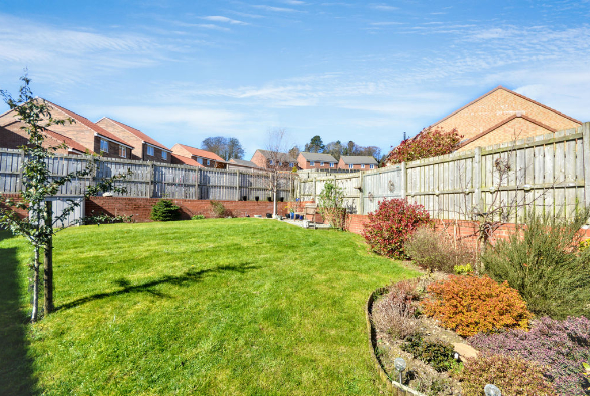 Rear garden mainly laid to lawn with wall and fence boundaries | Patio area | Planted trees, bushes, and shrubs | Side gate access to front of property