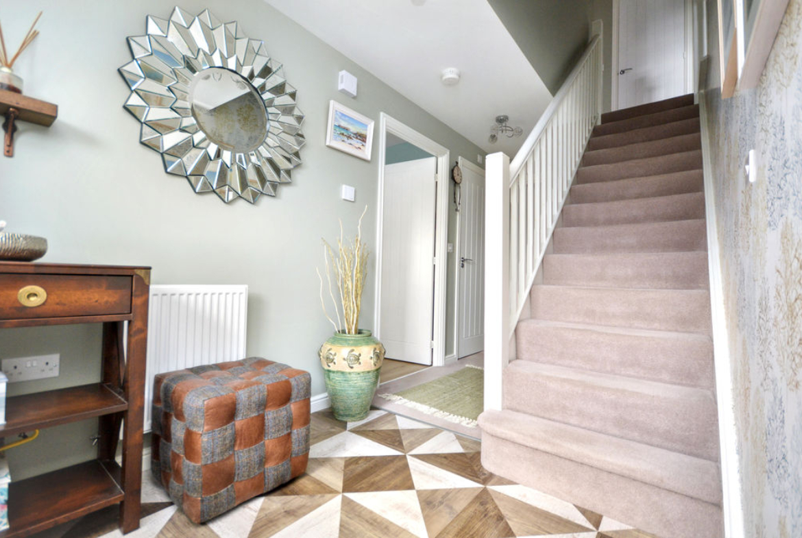 Double-glazed composite entrance door | Under-stairs storage cupboard | Radiator | Part-Karndean/part carpeted flooring | Doors to; study, living room, W.C. and kitchen