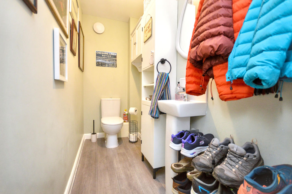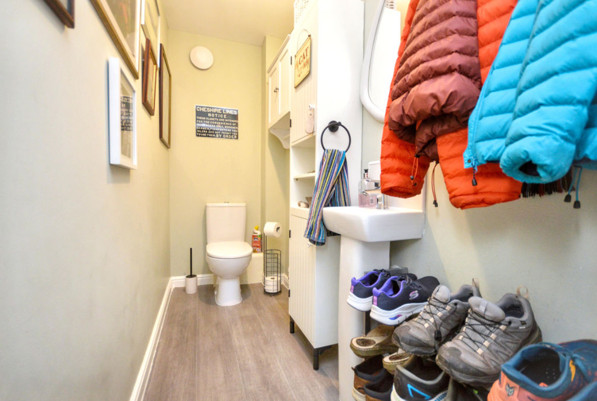 Close coupled W.C. | Pedestal wash-hand basin with tiled splashback | Radiator | Extractor fan