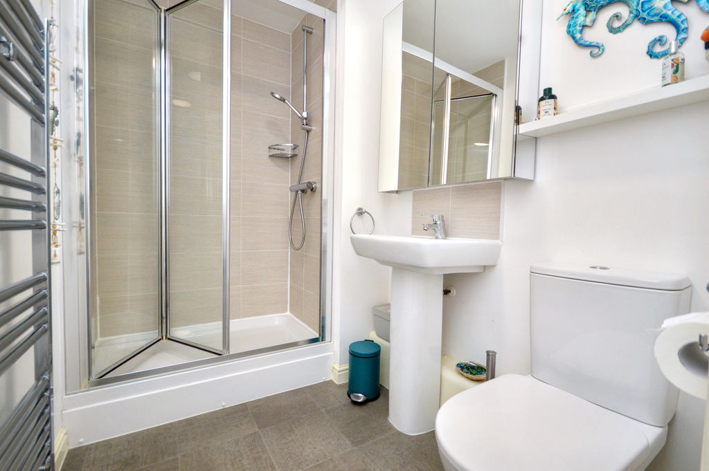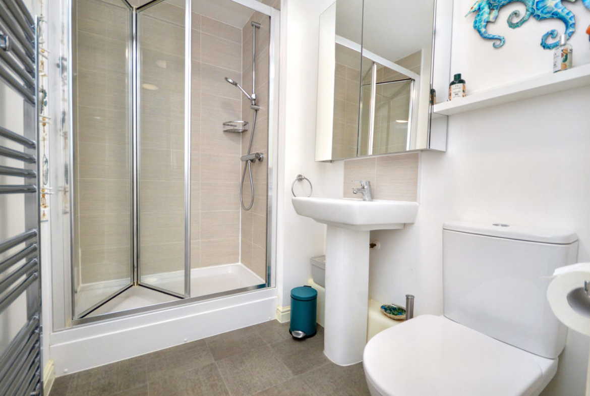 Tiled double shower cubicle incorporating a mains shower | Pedestal wash-hand basin with tiled splashback | Close coupled W.C. | Chrome ladder style radiator | Extractor